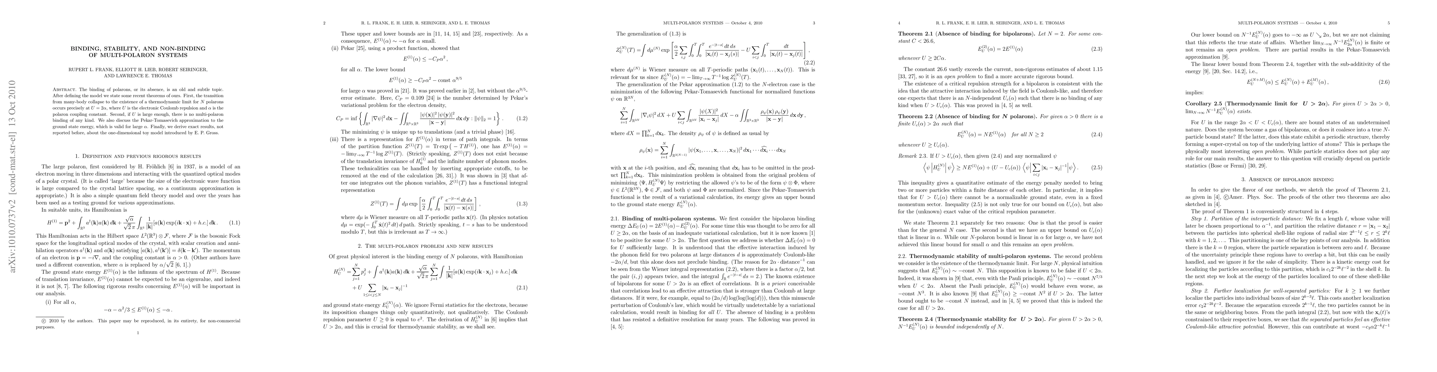 The binding of polarons, or its absence, is an old and subtle topic. After defining the model we state some recent theorems of ours. First, the transition from many-body collapse to the existence of a thermodynamic limit for N polarons occurs precisely at U=2\alpha, where U is the electronic Coulomb repulsion and \alpha is the polaron coupling constant. Second, if U is large enough, there is no multi-polaron binding of any kind. We also discuss the Pekar-Tomasevich approximation to the ground state energy, which is valid for large \alpha. Finally, we derive exact results, not reported before, about the one-dimensional toy model introduced by E. P. Gross.