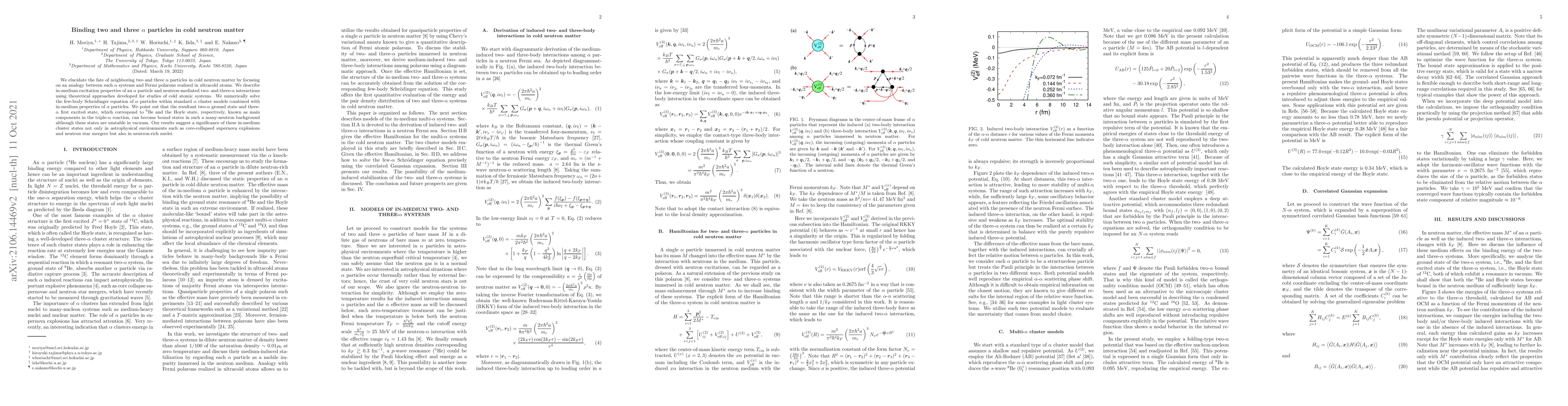 We elucidate the fate of neighboring two and three-$\alpha$ particles in cold neutron matter by focusing on an analogy between such $\alpha$ systems and Fermi polarons realized in ultracold atoms. We describe in-medium excitation properties of an $\alpha$ particle and neutron-mediated two- and three-$\alpha$ interactions using theoretical approaches developed for studies of cold atomic systems. We numerically solve the few-body Schr\"odinger equation of $\alpha$ particles within standard $\alpha$ cluster models combined with in-medium properties of $\alpha$ particles. We point out that the resultant two-$\alpha$ ground state and three-$\alpha$ first excited state, which correspond to $^8$Be and the Hoyle state, respectively, known as main components in the triple-$\alpha$ reaction, can become bound states in such a many-neutron background although these states are unstable in vacuum. Our results suggest a significance of these in-medium cluster states not only in astrophysical environments such as core-collapsed supernova explosions and neutron star mergers but also in neutron-rich nuclei.