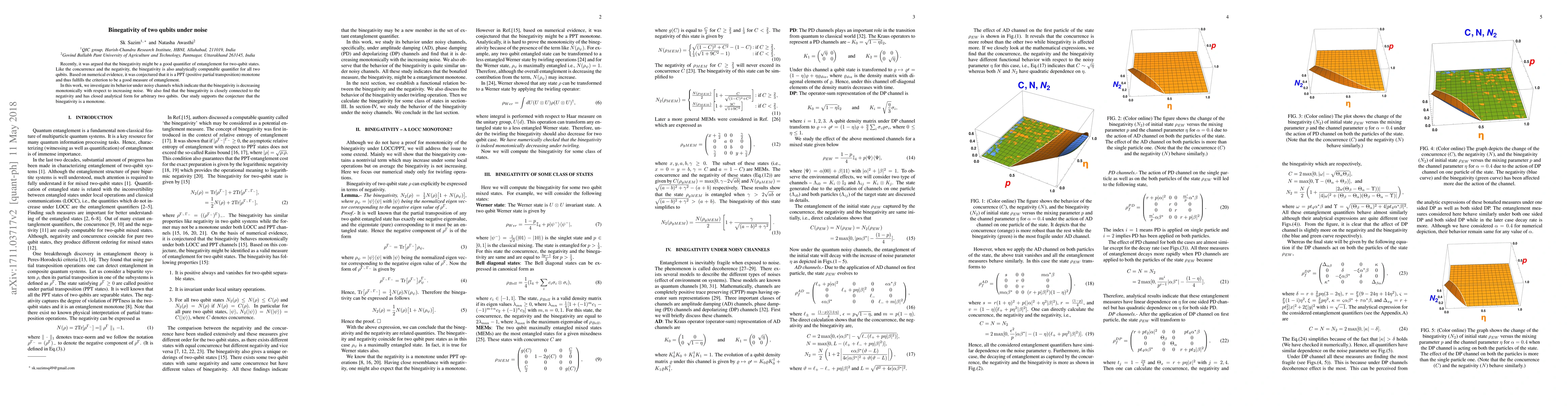 This paper investigates the behavior of binegativity, a proposed entanglement measure for two-qubit states, under noisy channels, finding that it decreases monotonically with increasing noise. The study supports the conjecture that binegativity is a PPT monotone, closely connected to the negativity, and has a closed analytical form for arbitrary two-qubit states.