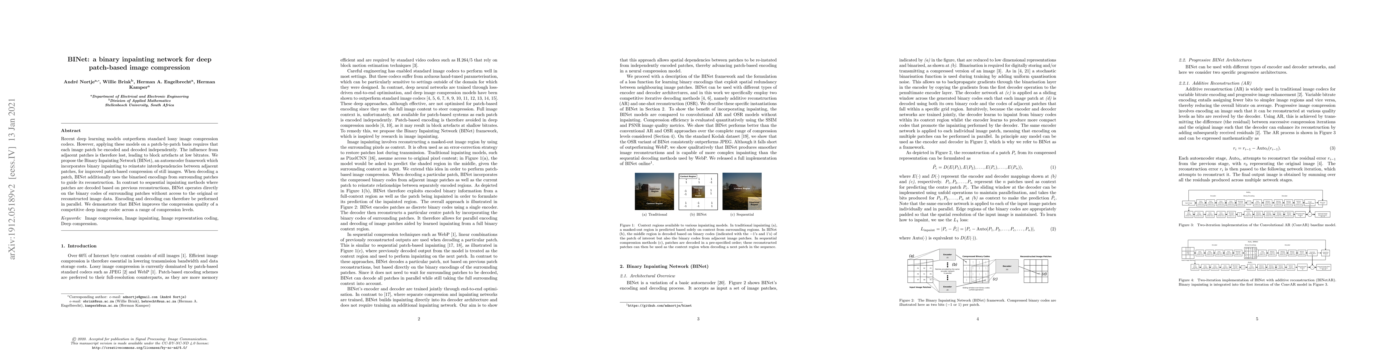 The BINet framework proposes a binary inpainting autoencoder for patch-based image compression, enhancing interdependencies between adjacent patches to reduce block artifacts. Unlike sequential methods, BINet uses binary codes from surrounding patches directly, enabling parallel encoding and decoding for improved compression quality.