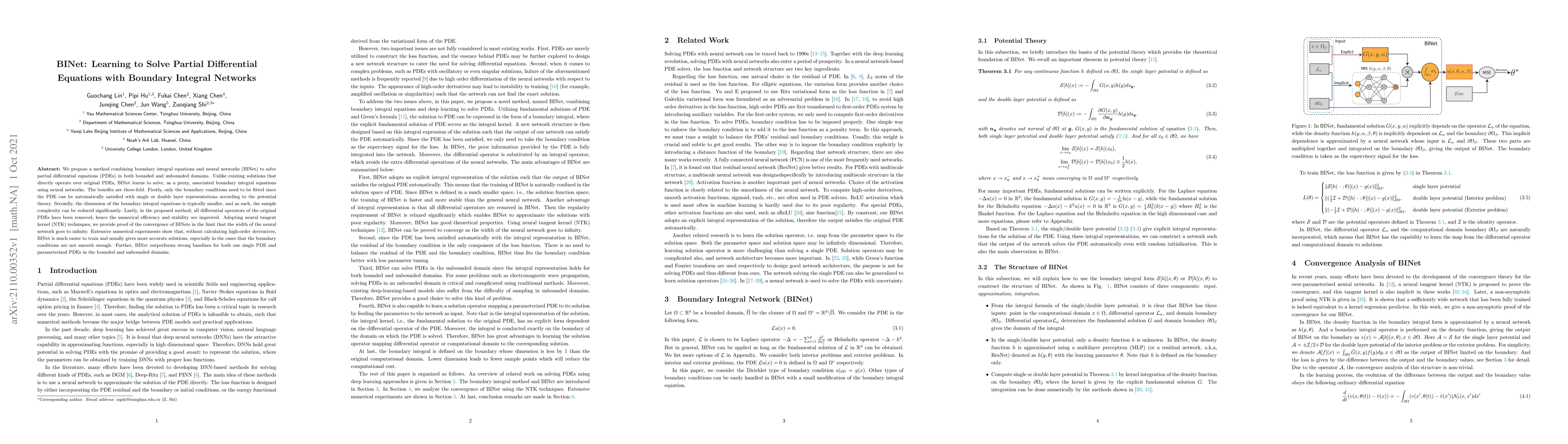 BINet combines boundary integral equations with neural networks to solve PDEs efficiently by learning to solve associated boundary integral equations, offering improved numerical efficiency, stability, and accuracy, especially for non-smooth boundary conditions. Extensive experiments show BINet's superior performance over existing methods.