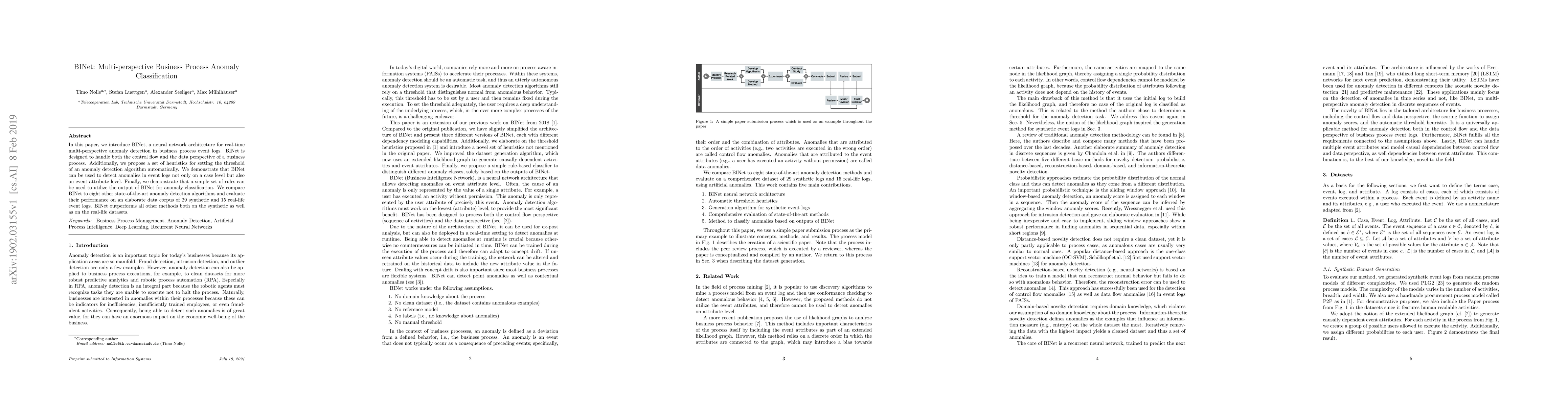 BINet is a neural network architecture for real-time multi-perspective anomaly detection in business process event logs, excelling in both control flow and data perspective analysis. It outperforms eight other state-of-the-art methods on both synthetic and real-life datasets.