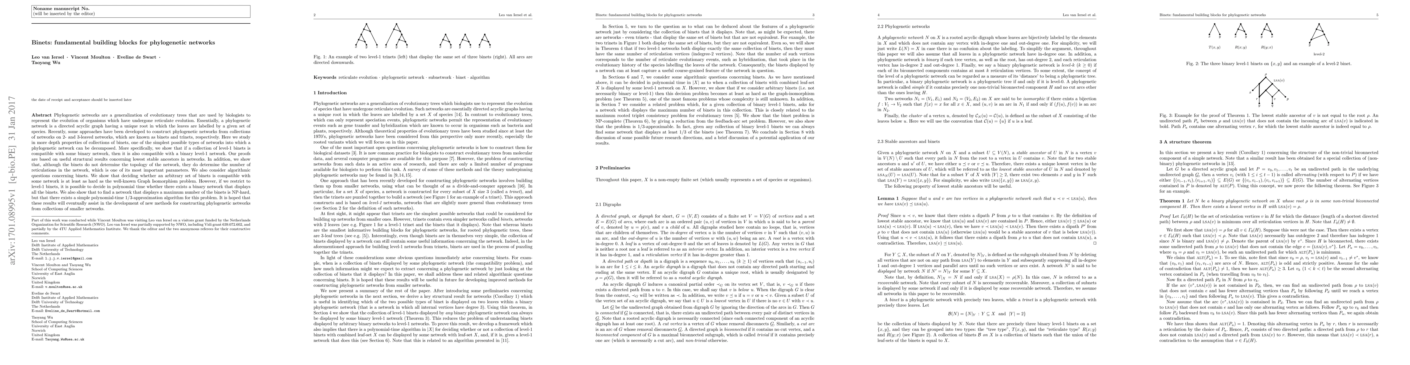 Phylogenetic networks are a generalization of evolutionary trees that are used by biologists to represent the evolution of organisms which have undergone reticulate evolution. Essentially, a phylogenetic network is a directed acyclic graph having a unique root in which the leaves are labelled by a given set of species. Recently, some approaches have been developed to construct phylogenetic networks from collections of networks on 2- and 3-leaved networks, which are known as binets and trinets, respectively. Here we study in more depth properties of collections of binets, one of the simplest possible types of networks into which a phylogenetic network can be decomposed. More specifically, we show that if a collection of level-1 binets is compatible with some binary network, then it is also compatible with a binary level-1 network. Our proofs are based on useful structural results concerning lowest stable ancestors in networks. In addition, we show that, although the binets do not determine the topology of the network, they do determine the number of reticulations in the network, which is one of its most important parameters. We also consider algorithmic questions concerning binets. We show that deciding whether an arbitrary set of binets is compatible with some network is at least as hard as the well-known Graph Isomorphism problem. However, if we restrict to level-1 binets, it is possible to decide in polynomial time whether there exists a binary network that displays all the binets. We also show that to find a network that displays a maximum number of the binets is NP-hard, but that there exists a simple polynomial-time 1/3-approximation algorithm for this problem. It is hoped that these results will eventually assist in the development of new methods for constructing phylogenetic networks from collections of smaller networks.