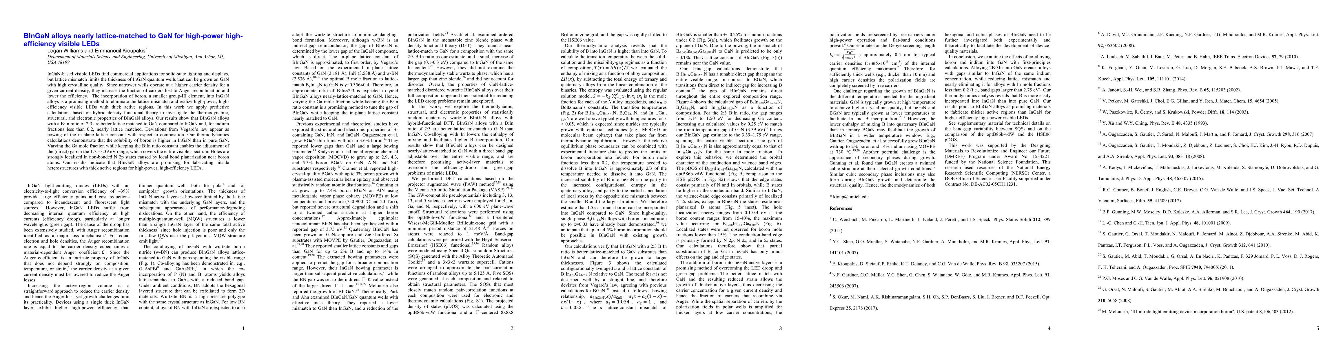 This study investigates BInGaN alloys to nearly lattice-match with GaN, aiming to enhance the efficiency of high-power visible LEDs. The research shows that BInGaN with a B:In ratio of 2:3 achieves better lattice matching and tunable bandgaps, suggesting potential for high-efficiency LED fabrication.