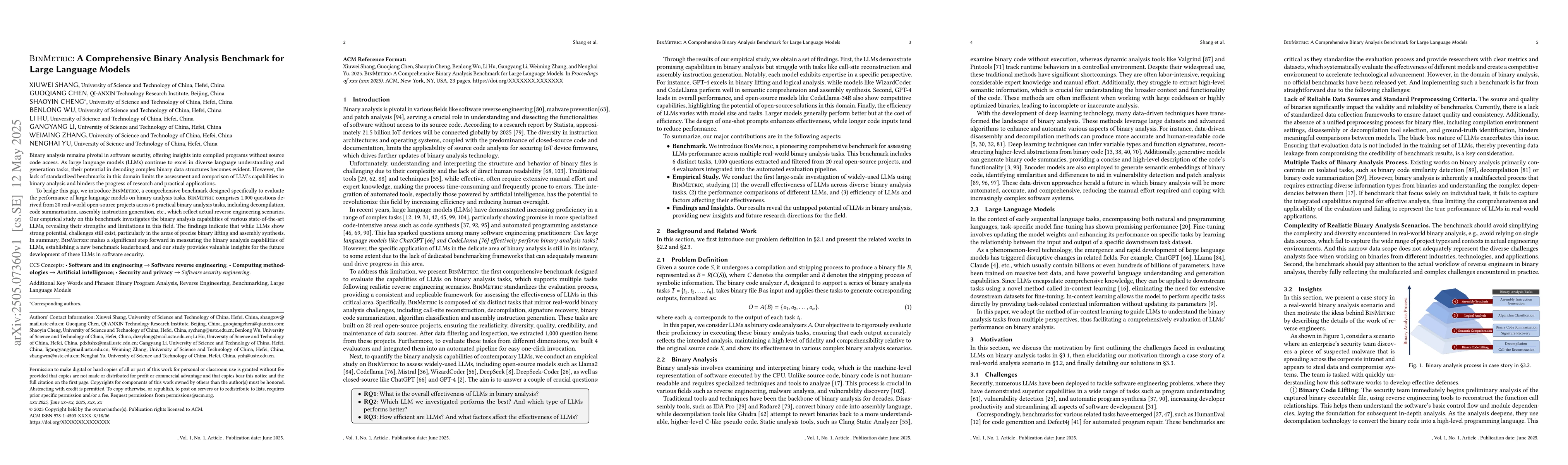 BinMetric, a comprehensive benchmark with 1,000 questions for evaluating LLMs in binary analysis tasks, along with an empirical study on various state-of-the-art LLMs.