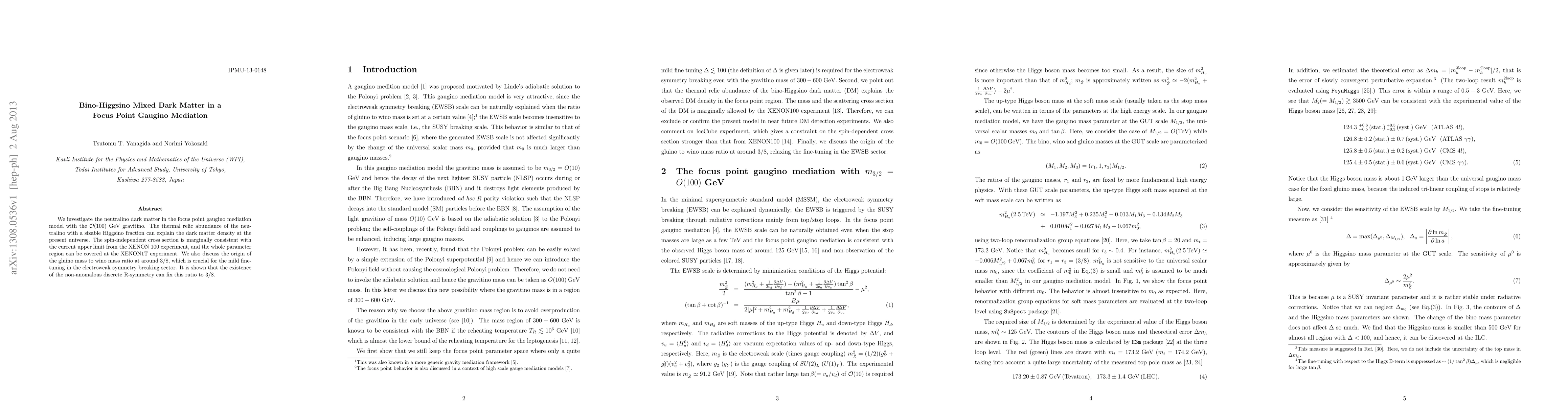 We investigate the neutralino dark matter in the focus point gaugino mediation model with the O(100) GeV gravitino. The thermal relic abundance of the neutralino with a sizable Higgsino fraction can explain the dark matter density at the present universe. The spin-independent cross section is marginally consistent with the current upper limit from the XENON 100 experiment, and the whole parameter region can be covered at the XENON1T experiment. We also discuss the origin of the gluino mass to wino mass ratio at around 3/8, which is crucial for the mild fine-tuning in the electroweak symmetry breaking sector. It is shown that the existence of the non-anomalous discrete R-symmetry can fix this ratio to 3/8.