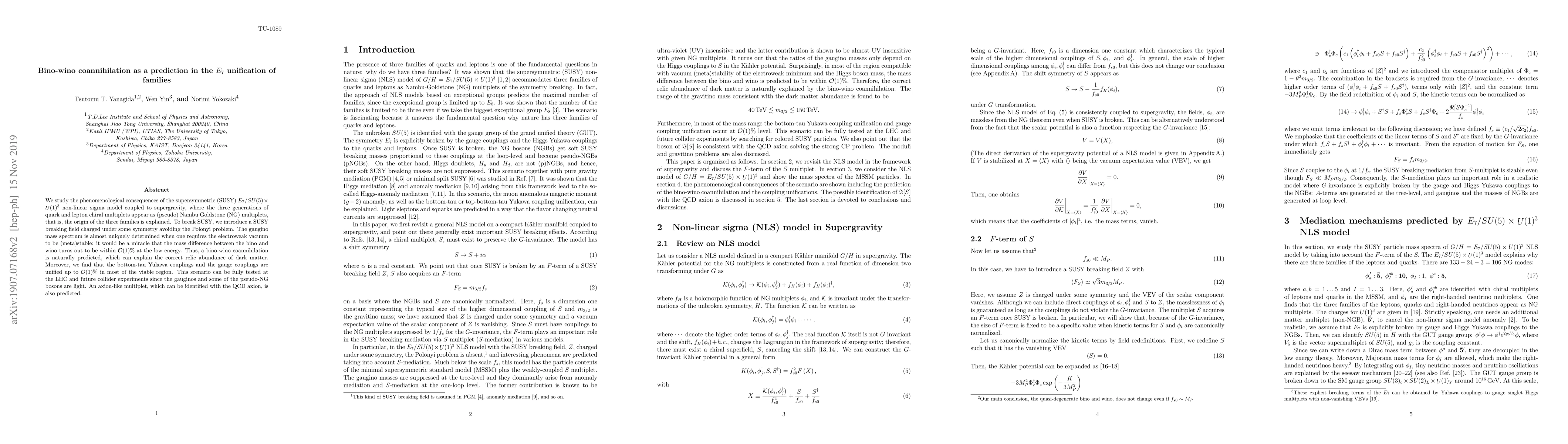 We study the phenomenological consequences of the supersymmetric (SUSY) $E_7/SU(5)\times U(1)^3$ non-linear sigma model coupled to supergravity, where the three generations of quark and lepton chiral multiplets appear as (pseudo) Nambu Goldstone (NG) multiplets, that is, the origin of the three families is explained. To break SUSY, we introduce a SUSY breaking field charged under some symmetry avoiding the Polonyi problem. The gaugino mass spectrum is almost uniquely determined when one requires the electroweak vacuum to be (meta)stable: it would be a miracle that the mass difference between the bino and wino turns out to be within $O(1)\%$ at the low energy. Thus, a bino-wino coannihilation is naturally predicted, which can explain the correct relic abundance of dark matter. Moreover, we find that the bottom-tau Yukawa couplings and the gauge couplings are unified up to $O(1)\%$ in most of the viable region. This scenario can be fully tested at the LHC and future collider experiments since the gauginos and some of the pseudo-NG bosons are light. An axion-like multiplet, which can be identified with the QCD axion, is also predicted.