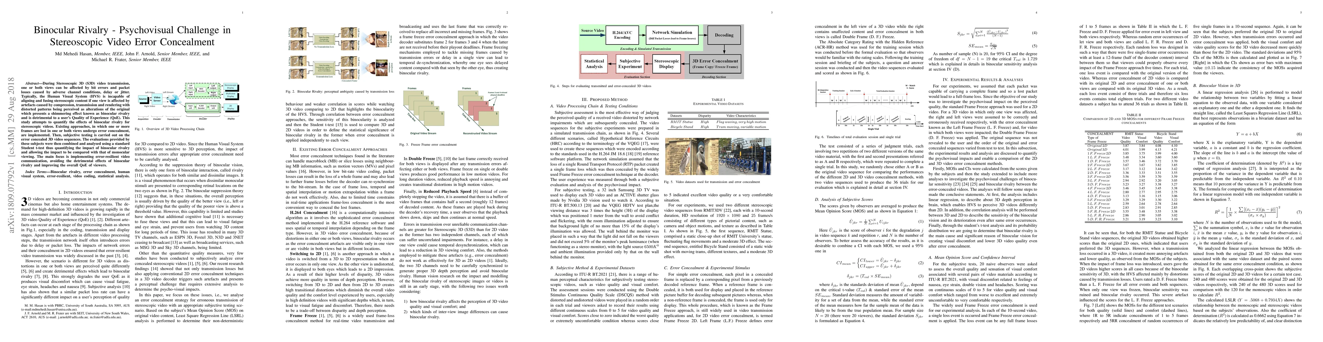 During Stereoscopic 3D (S3D) video transmission, one or both views can be affected by bit errors and packet losses caused by adverse channel conditions, delay or jitter. Typically, the Human Visual System (HVS) is incapable of aligning and fusing stereoscopic content if one view is affected by artefacts caused by compression, transmission and rendering with distorted patterns being perceived as alterations of the original which presents a shimmering effect known as binocular rivalry and is detrimental to a user's Quality of Experience (QoE). This study attempts to quantify the effects of binocular rivalry for stereoscopic videos. Existing approaches, in which one or more frames are lost in one or both views undergo error concealment, are implemented. Then, subjective testing is carried out on the error concealed 3D video sequences. The evaluations provided by these subjects were then combined and analysed using a standard Student t-test thus quantifying the impact of binocular rivalry and allowing the impact to be compared with that of monocular viewing. The main focus is implementing error-resilient video communication, avoiding the detrimental effects of binocular rivalry and improving the overall QoE of viewers.