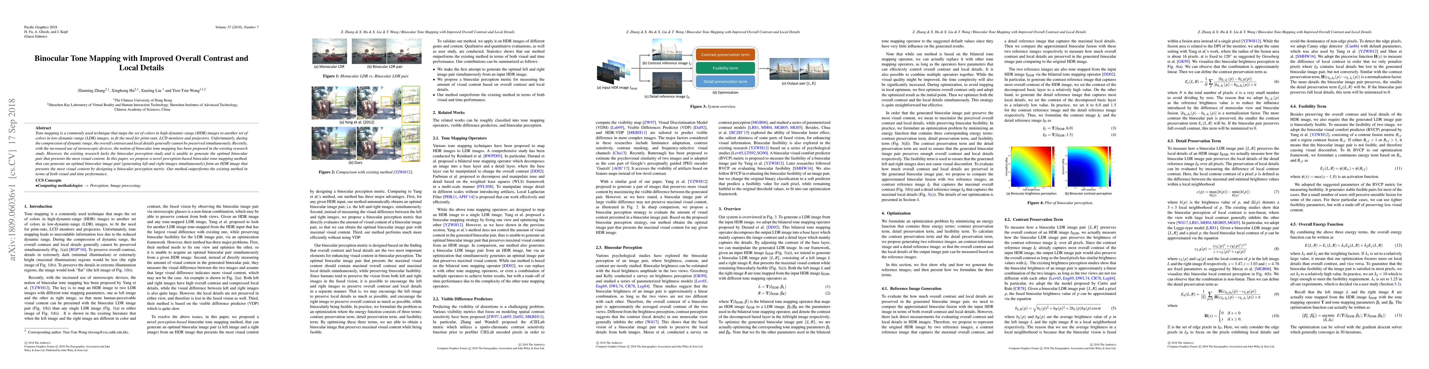 This paper proposes a novel binocular tone mapping method that preserves both overall contrast and local details in stereoscopic images, outperforming existing methods in terms of visual and time performance.