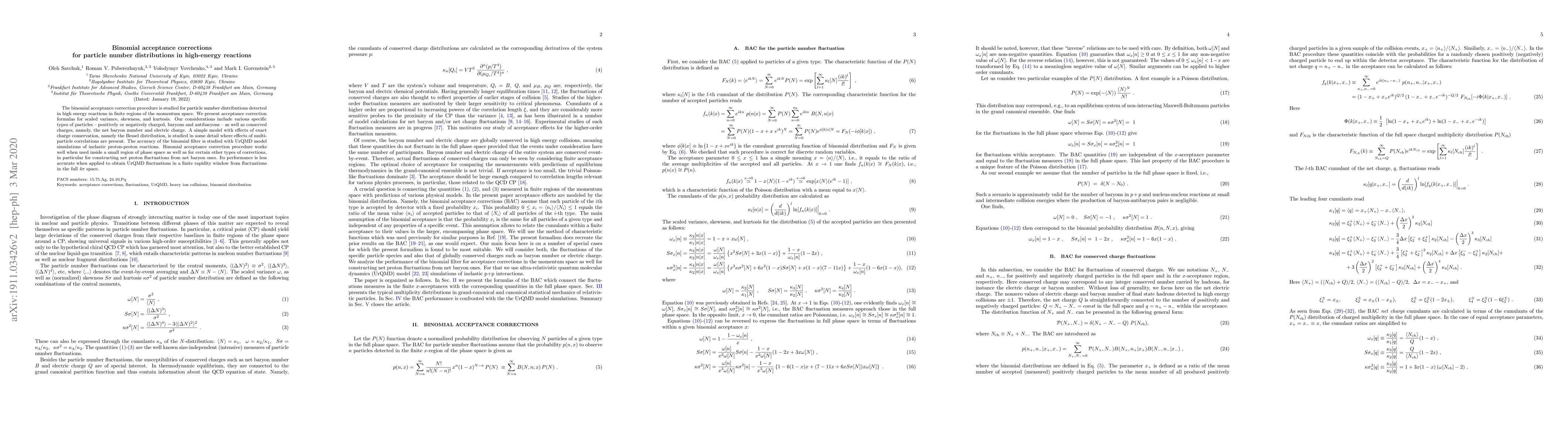 This paper develops binomial acceptance correction formulas for particle number distributions in high-energy reactions, focusing on finite momentum regions. It evaluates the method's accuracy using simulations from the UrQMD model, showing its effectiveness for small phase space regions and specific efficiency corrections.