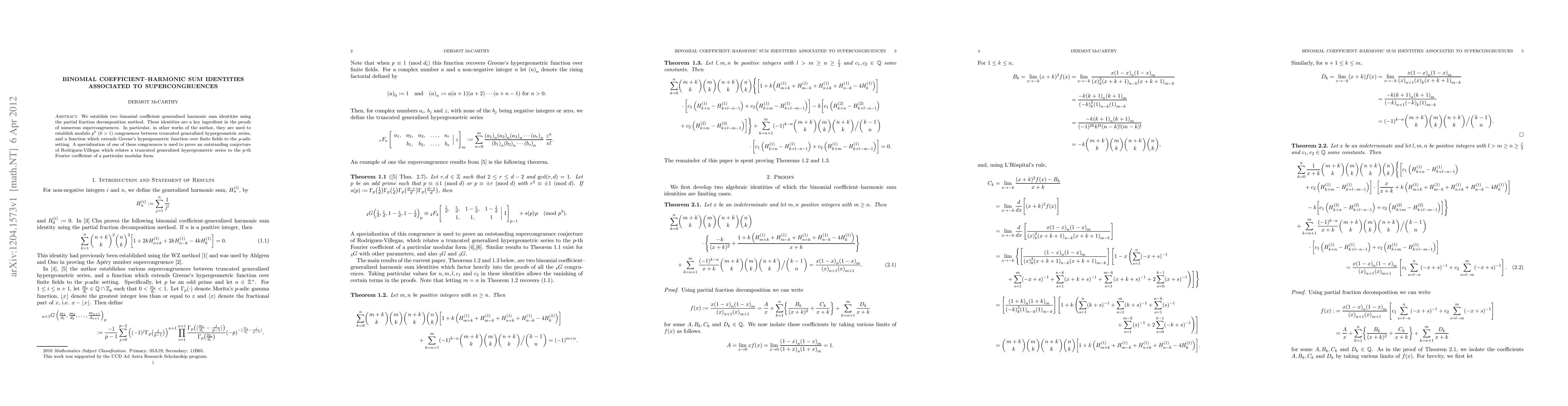 We establish two binomial coefficient--generalized harmonic sum identities using the partial fraction decomposition method. These identities are a key ingredient in the proofs of numerous supercongruences. In particular, in other works of the author, they are used to establish modulo $p^k$ ($k>1$) congruences between truncated generalized hypergeometric series, and a function which extends Greene's hypergeometric function over finite fields to the $p$-adic setting. A specialization of one of these congruences is used to prove an outstanding conjecture of Rodriguez-Villegas which relates a truncated generalized hypergeometric series to the $p$-th Fourier coefficient of a particular modular form.