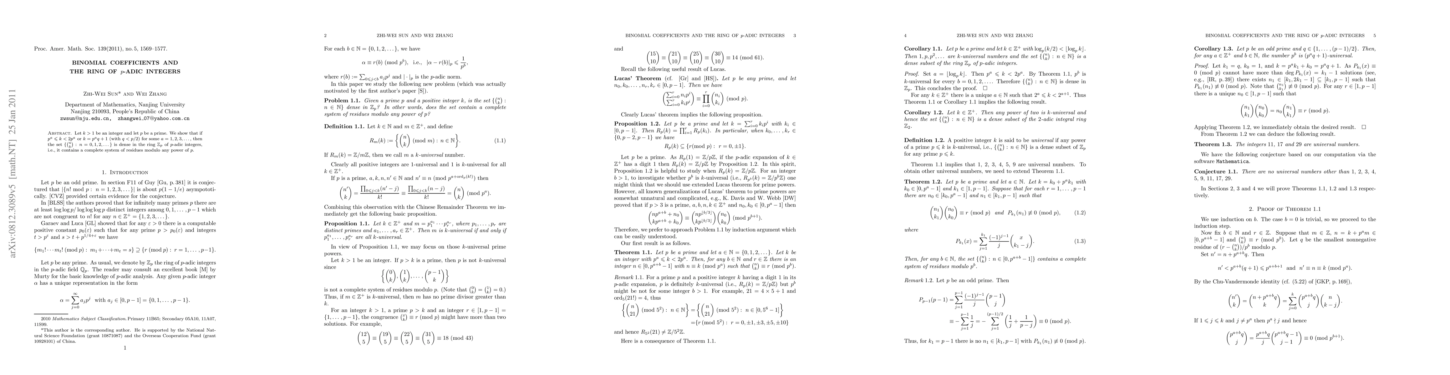 This paper demonstrates that for certain integers k relative to a prime p, the binomial coefficients $\binom{n}{k}$ form a dense subset in the ring of p-adic integers $\mathbb{Z}_p$, containing a complete system of residues modulo any power of p.