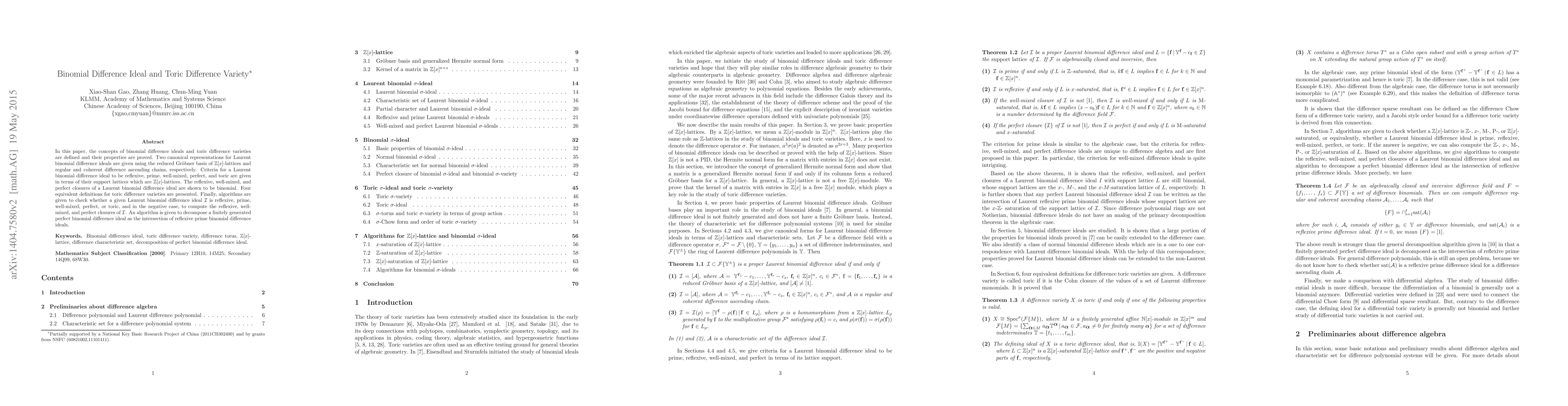 This paper defines binomial difference ideals and toric difference varieties, providing criteria and algorithms to determine their properties and closures. It also presents algorithms for decomposing perfect binomial difference ideals and checking their reflexive, prime, well-mixed, and perfect attributes.