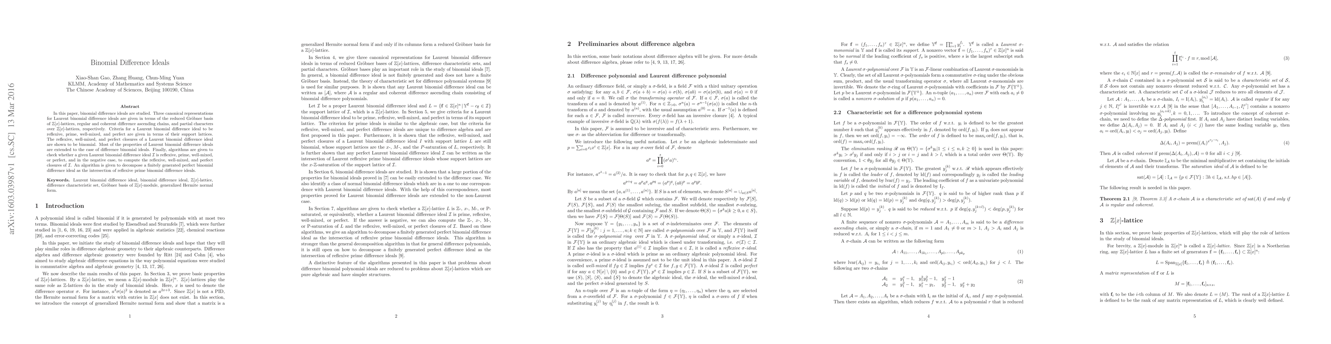 The research employs algebraic methods, specifically Gröbner basis theory, extended to the difference case. It studies binomial difference ideals in Z[x]-lattices, providing canonical representations and criteria for properties like reflexivity, primality, well-mixedness, and perfection.
