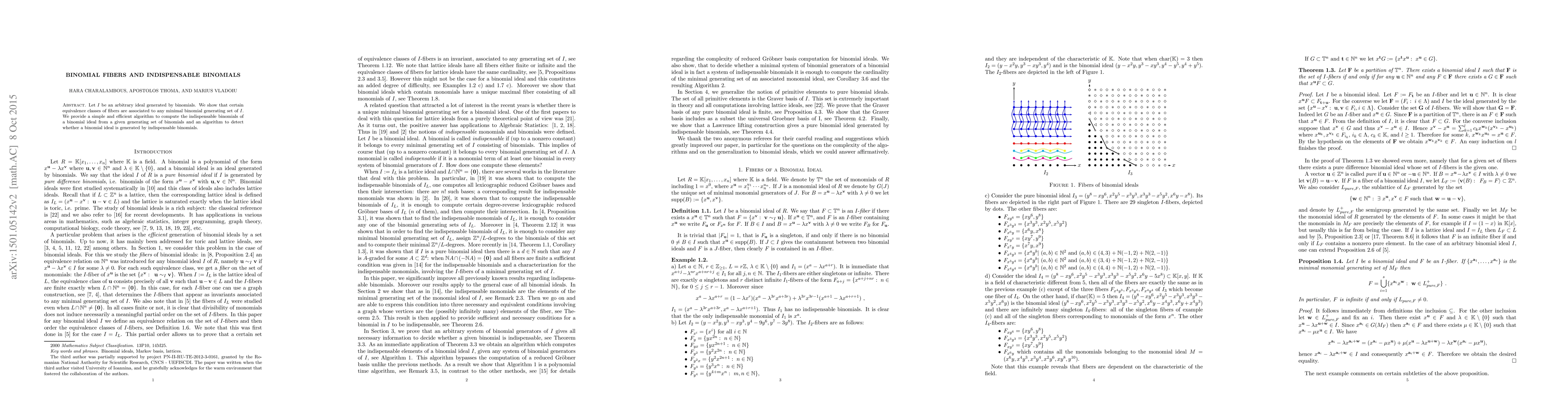 This paper explores the relationship between binomial fibers and indispensable binomials in ideals generated by binomials, presenting algorithms to compute indispensable binomials and determine if a binomial ideal is generated solely by them.