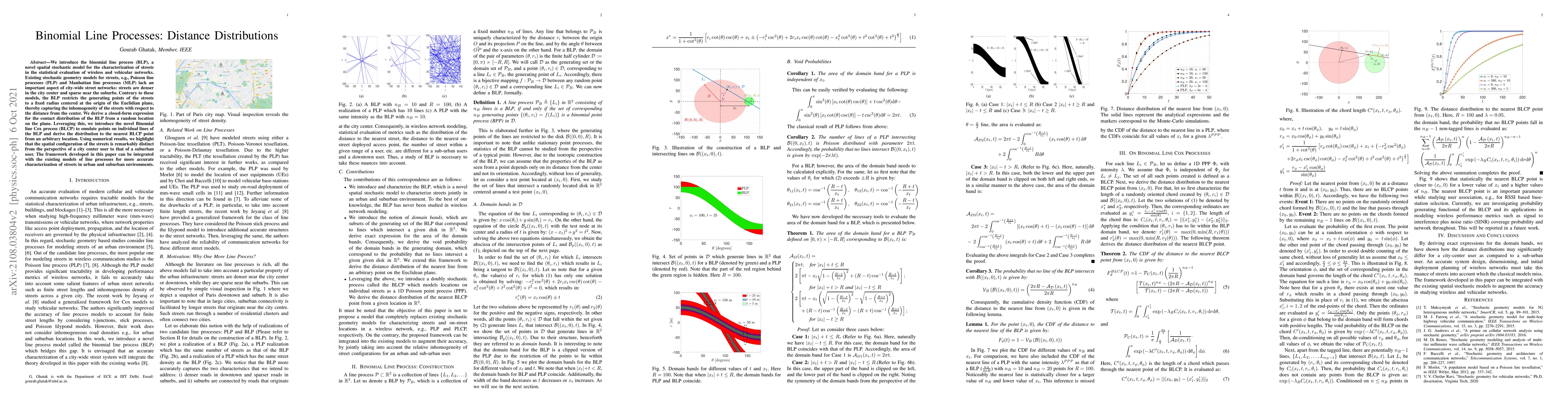 We introduce the binomial line process (BLP), a novel spatial stochastic model for the characterization of streets in the statistical evaluation of wireless and vehicular networks. Existing stochastic geometry models for streets, e.g., Poisson line processes (PLP) and Manhattan line processes (MLP) lack an important aspect of city-wide street networks: streets are denser in the city center and sparse near the suburbs. Contrary to these models, the BLP restricts the generating points of the streets to a fixed radius centered at the origin of the Euclidian plane, thereby capturing the inhomogeneity of the streets with respect to the distance from the center. We derive a closed-form expression for the contact distribution of the BLP from a random location on the plane. Leveraging this, we introduce the novel Binomial line Cox process (BLCP) to emulate points on individual lines of the BLP and derive the distribution to the nearest BLCP point from an arbitrary location. Using numerical results, we highlight that the spatial configuration of the streets is remarkably distinct from the perspective of a city center user to that of a suburban user. The framework developed in this paper can be integrated with the existing models of line processes for more accurate characterization of streets in urban and suburban environments.
