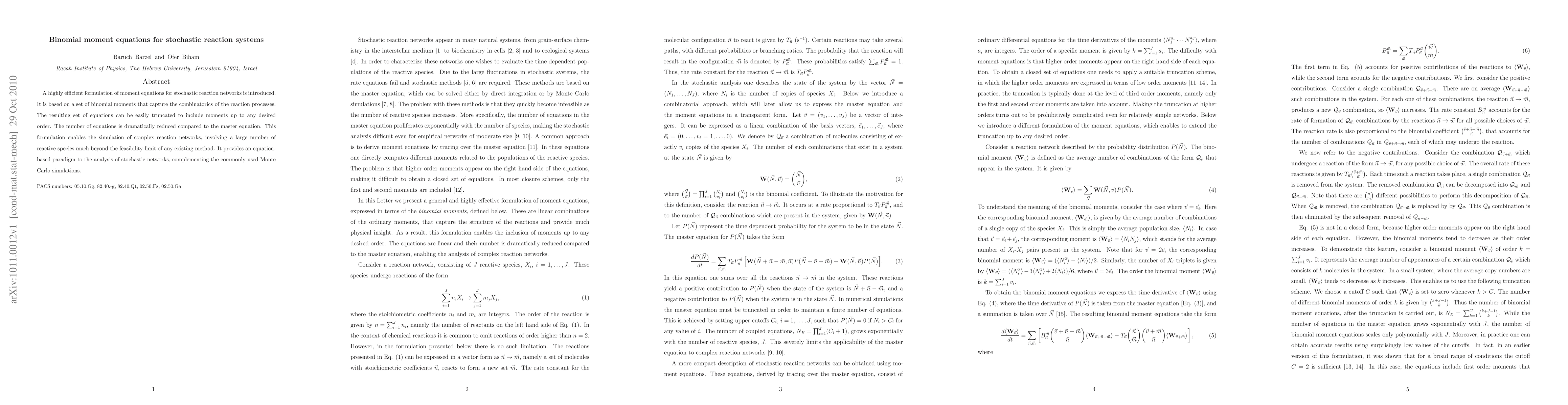 A highly efficient formulation of moment equations for stochastic reaction networks is introduced. It is based on a set of binomial moments that capture the combinatorics of the reaction processes. The resulting set of equations can be easily runcated to include moments up to any desired order. The number of equations is dramatically reduced compared to the master equation. This formulation enables the simulation of complex reaction networks, involving a large number of reactive species much beyond the feasibility limit of any existing method. It provides an equation-based paradigm to the analysis of stochastic networks, complementing the commonly used Monte Carlo simulations.