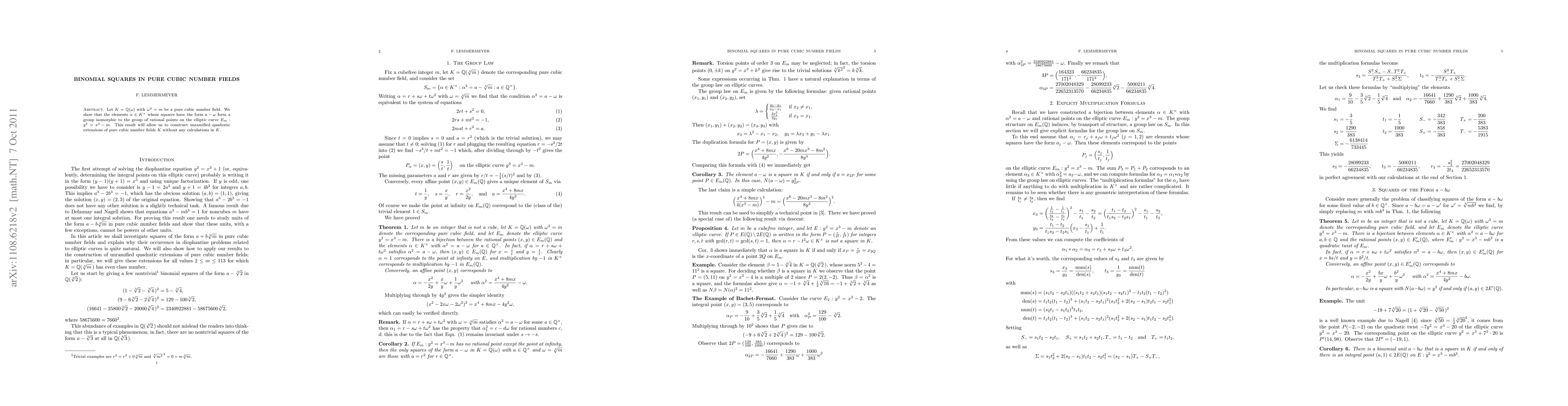 Let K = Q(\omega) with \omega^3 = m be a pure cubic number field. We show that the elements\alpha \in K^\times whose squares have the form a - \omega form a group isomorphic to the group of rational points on the elliptic curve E_m: y^2= x^3 - m. We also show how to apply these results to the construction of unramified quadratic extensions of pure cubic number fields.