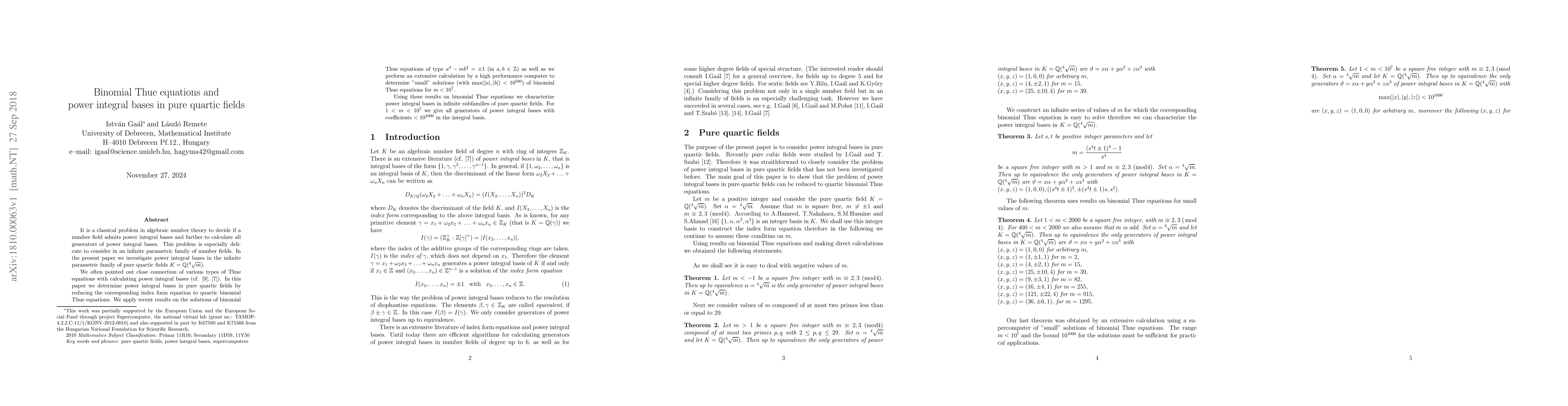 This paper investigates power integral bases in pure quartic fields $K=Q(\sqrt[4]{m})$, reducing the index form equation to quartic binomial Thue equations. It determines these bases using solutions to specific binomial Thue equations and extensive computer calculations, providing all generators for fields with $1< m< 10^7$ having coefficients less than $10^{1000}$.