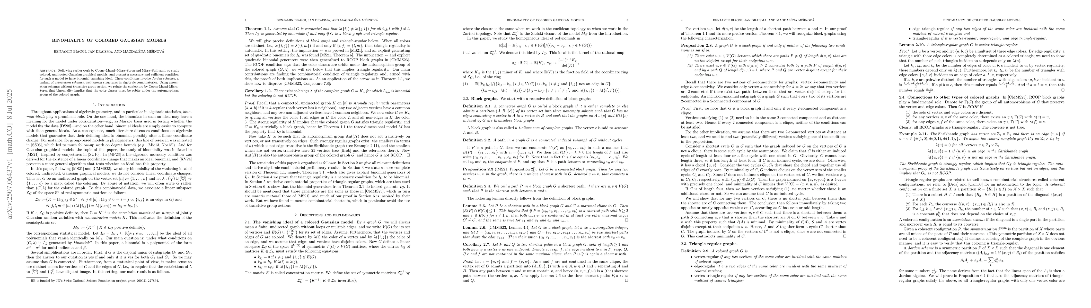 Following earlier work by Coons-Maraj-Misra-Sorea and Misra-Sullivant, we study colored, undirected Gaussian graphical models, and present a necessary and sufficient condition for such a model to have binomial vanishing ideal. These conditions involve Jordan schemes, a variant of association schemes, well-known structures in algebraic combinatorics. Using association schemes without transitive group action, we refute the conjecture by Coons-Maraj-Misra-Sorea that binomiality implies that the color classes must be orbits under the automorphism group of the colored graph.