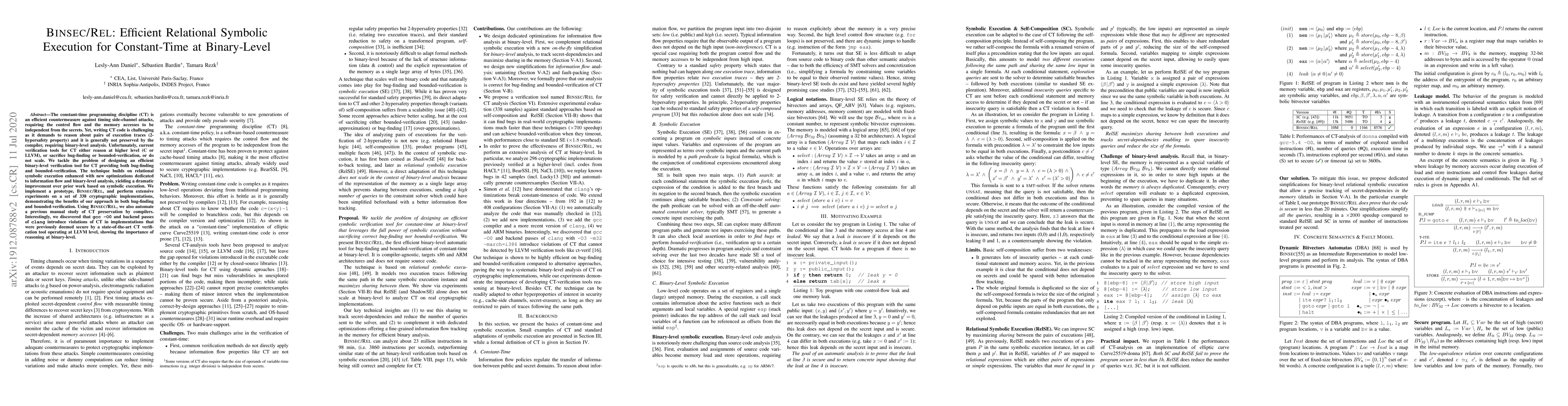 The paper presents Binsec/Rel, an efficient binary-level verification tool for constant-time programming that combines relational symbolic execution with optimizations for information flow analysis. The tool demonstrates improved performance in bug-finding and bounded-verification compared to higher-level verification methods, and reveals compiler-induced violations of constant-time properties in cryptographic implementations.