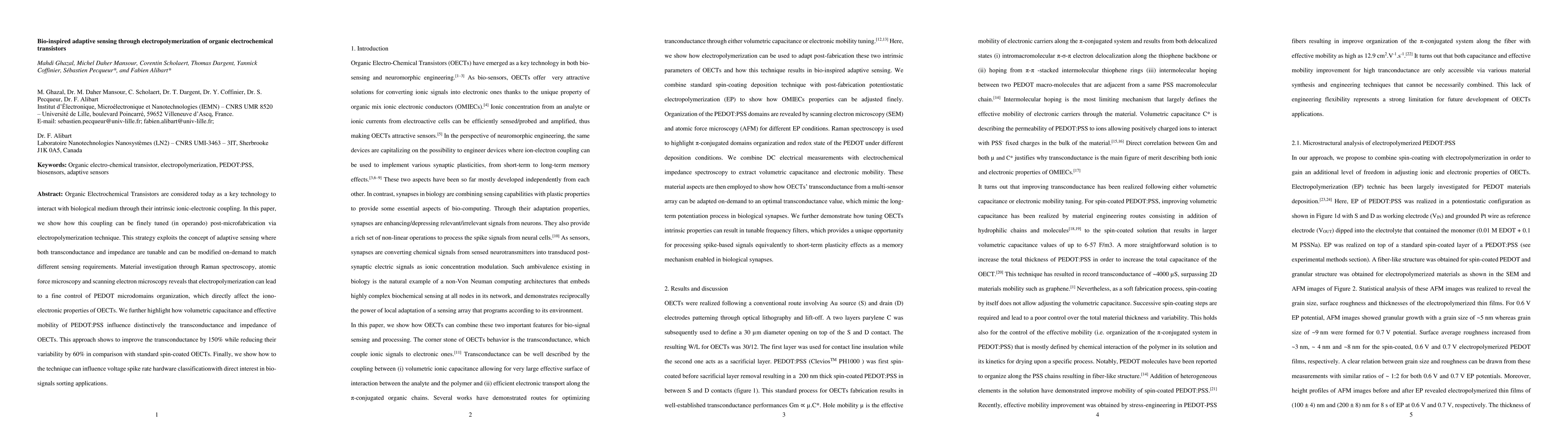 This paper demonstrates adaptive sensing through electropolymerization of Organic Electrochemical Transistors, showing improved transconductance and reduced variability by tuning iono-electronic properties post-fabrication. The technique enhances bio-signal sorting applications by influencing the voltage spike rate.