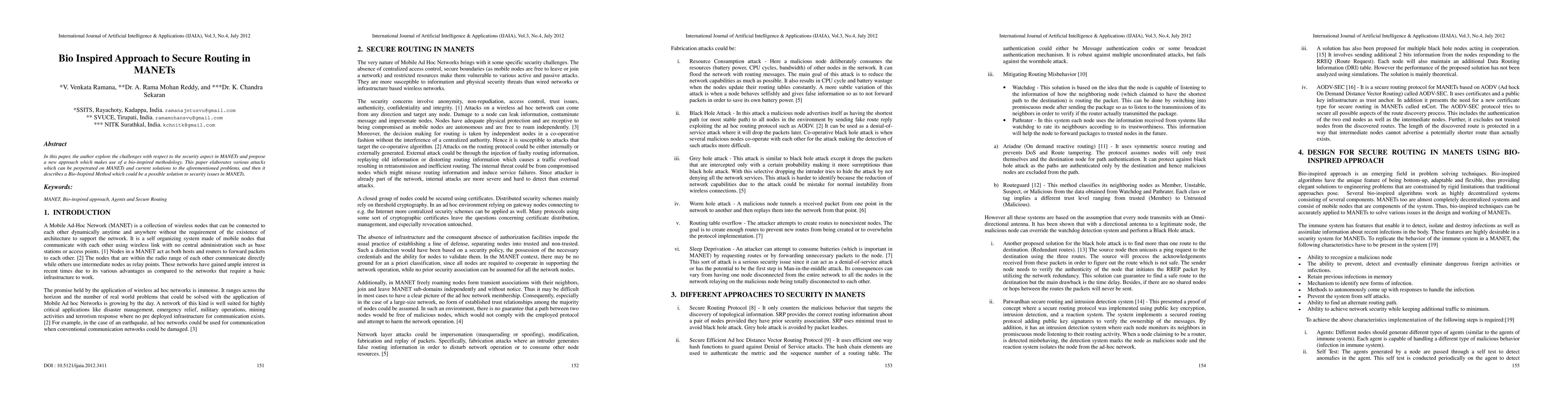In this paper, the author explore the challenges with respect to the security aspect in MANETs and propose a new approach which makes use of a bio-inspired methodology. This paper elaborates various attacks which can be perpetrated on MANETs and current solutions to the aforementioned problems, and then it describes a Bio-Inspired Method which could be a possible solution to security issues in MANETs.