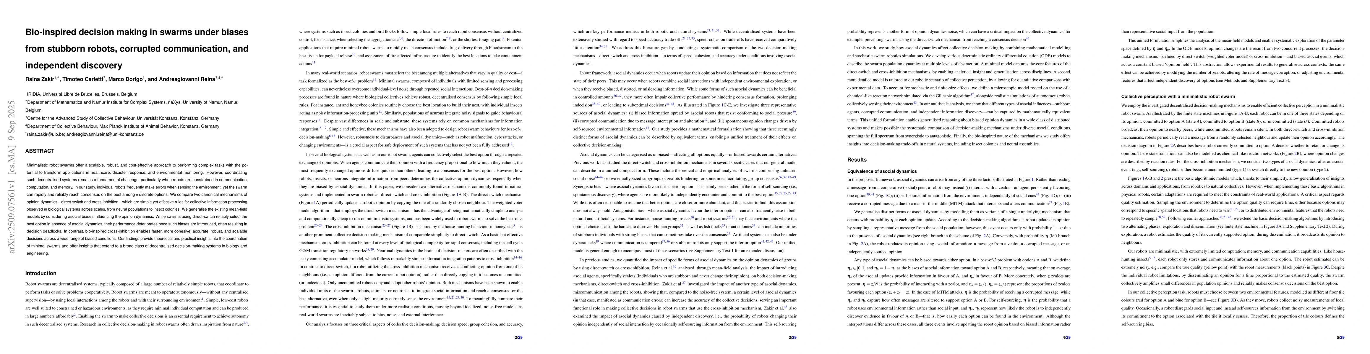 Minimalistic robot swarms offer a scalable, robust, and cost-effective approach to performing complex tasks with the potential to transform applications in healthcare, disaster response, and environmental monitoring. However, coordinating such decentralised systems remains a fundamental challenge, particularly when robots are constrained in communication, computation, and memory. In our study, individual robots frequently make errors when sensing the environment, yet the swarm can rapidly and reliably reach consensus on the best among $n$ discrete options. We compare two canonical mechanisms of opinion dynamics -- direct-switch and cross-inhibition -- which are simple yet effective rules for collective information processing observed in biological systems across scales, from neural populations to insect colonies. We generalise the existing mean-field models by considering asocial biases influencing the opinion dynamics. While swarms using direct-switch reliably select the best option in absence of asocial dynamics, their performance deteriorates once such biases are introduced, often resulting in decision deadlocks. In contrast, bio-inspired cross-inhibition enables faster, more cohesive, accurate, robust, and scalable decisions across a wide range of biased conditions. Our findings provide theoretical and practical insights into the coordination of minimal swarms and offer insights that extend to a broad class of decentralised decision-making systems in biology and engineering.