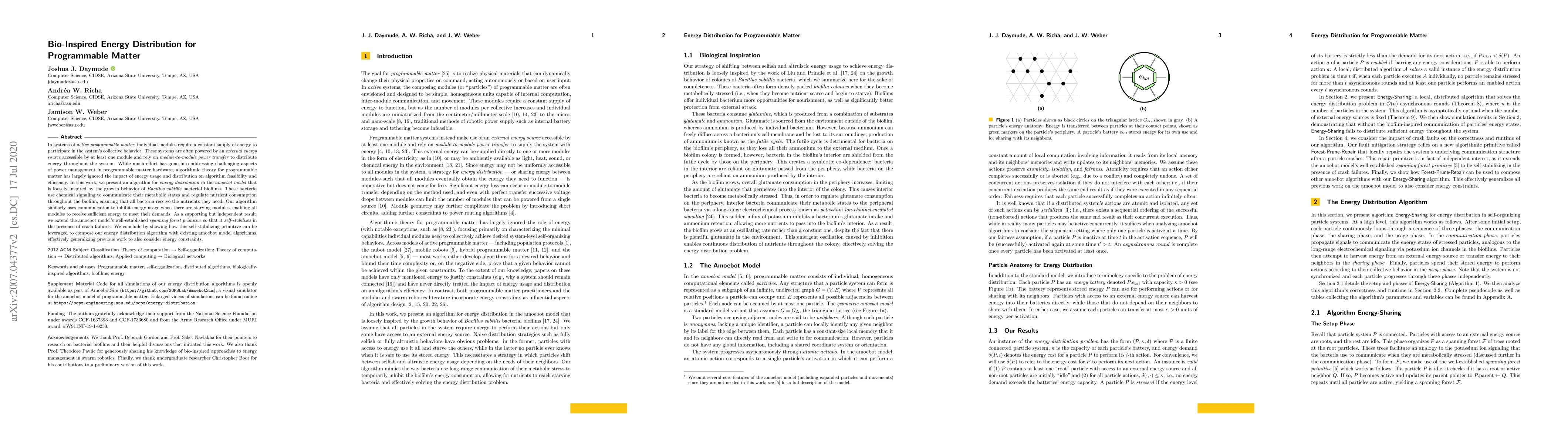 The paper introduces a bio-inspired energy distribution algorithm for programmable matter and extends the amoebot model's spanning forest primitive to self-stabilize against crash failures.