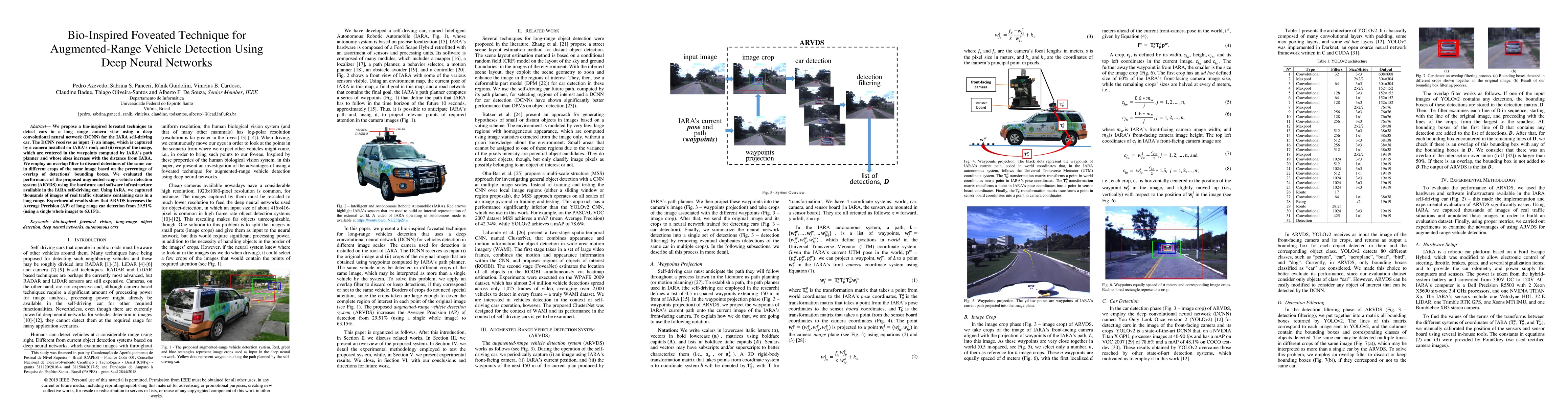We propose a bio-inspired foveated technique to detect cars in a long range camera view using a deep convolutional neural network (DCNN) for the IARA self-driving car. The DCNN receives as input (i) an image, which is captured by a camera installed on IARA's roof; and (ii) crops of the image, which are centered in the waypoints computed by IARA's path planner and whose sizes increase with the distance from IARA. We employ an overlap filter to discard detections of the same car in different crops of the same image based on the percentage of overlap of detections' bounding boxes. We evaluated the performance of the proposed augmented-range vehicle detection system (ARVDS) using the hardware and software infrastructure available in the IARA self-driving car. Using IARA, we captured thousands of images of real traffic situations containing cars in a long range. Experimental results show that ARVDS increases the Average Precision (AP) of long range car detection from 29.51% (using a single whole image) to 63.15%.