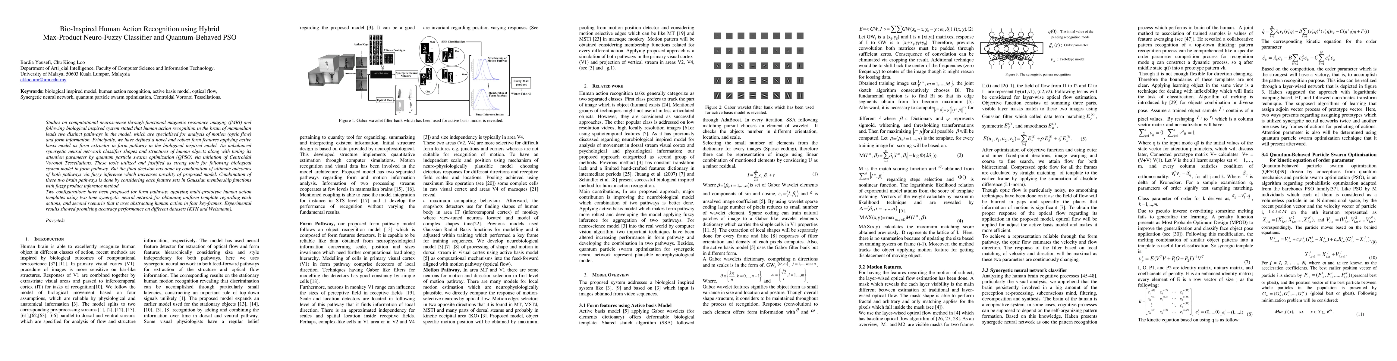 Studies on computational neuroscience through functional magnetic resonance imaging (fMRI) and following biological inspired system stated that human action recognition in the brain of mammalian leads two distinct pathways in the model, which are specialized for analysis of motion (optic flow) and form information. Principally, we have defined a novel and robust form features applying active basis model as form extractor in form pathway in the biological inspired model. An unbalanced synergetic neural net-work classifies shapes and structures of human objects along with tuning its attention parameter by quantum particle swarm optimization (QPSO) via initiation of Centroidal Voronoi Tessellations. These tools utilized and justified as strong tools for following biological system model in form pathway. But the final decision has done by combination of ultimate outcomes of both pathways via fuzzy inference which increases novality of proposed model. Combination of these two brain pathways is done by considering each feature sets in Gaussian membership functions with fuzzy product inference method. Two configurations have been proposed for form pathway: applying multi-prototype human action templates using two time synergetic neural network for obtaining uniform template regarding each actions, and second scenario that it uses abstracting human action in four key-frames. Experimental results showed promising accuracy performance on different datasets (KTH and Weizmann).