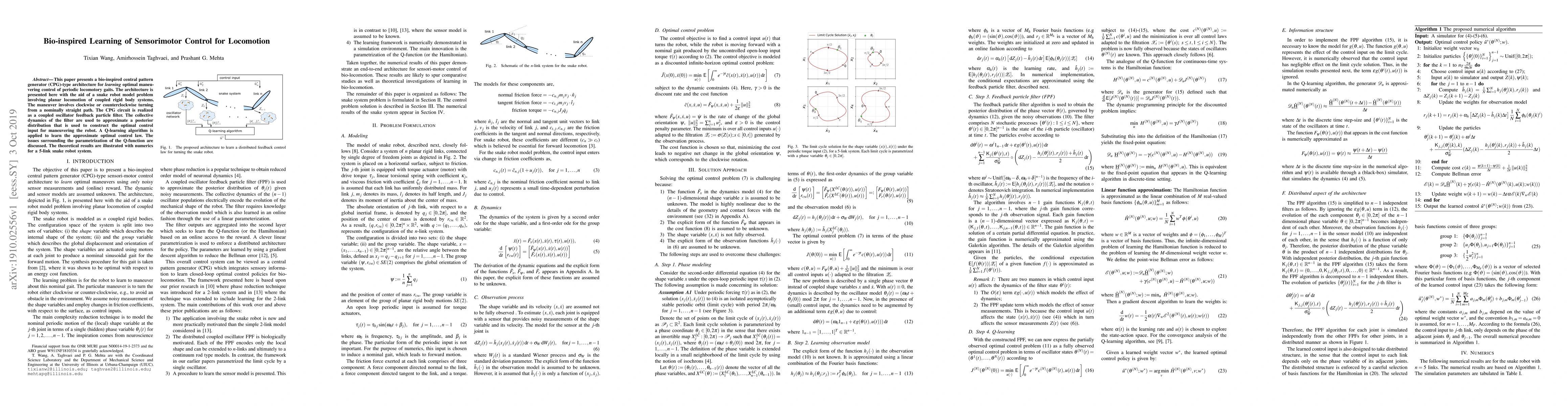This paper develops a bio-inspired central pattern generator architecture using a coupled oscillator feedback particle filter to learn optimal control for snake robot locomotion, employing Q-learning to refine the control law, and demonstrates the approach with a 5-link snake robot model.