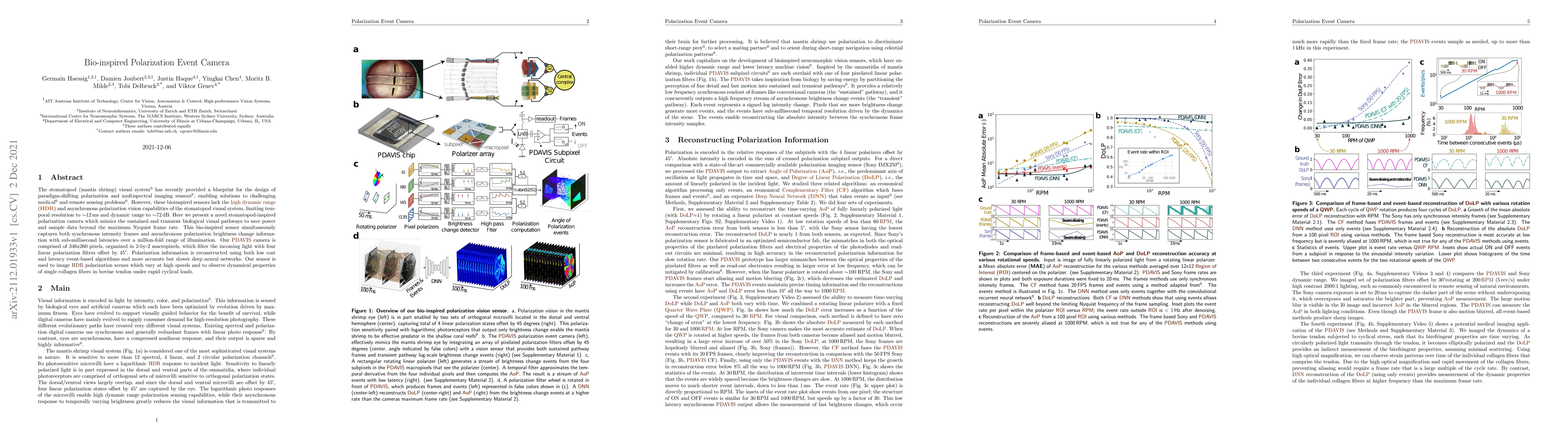 The paper introduces a novel bio-inspired polarization event camera inspired by the stomatopod visual system, achieving high dynamic range and asynchronous polarization vision to capture rapid changes in illumination and polarization with sub-millisecond latencies. The PDAVIS camera uses event-based algorithms and deep neural networks for polarization reconstruction and is demonstrated in imaging high-speed dynamic scenes and collagen fiber dynamics.