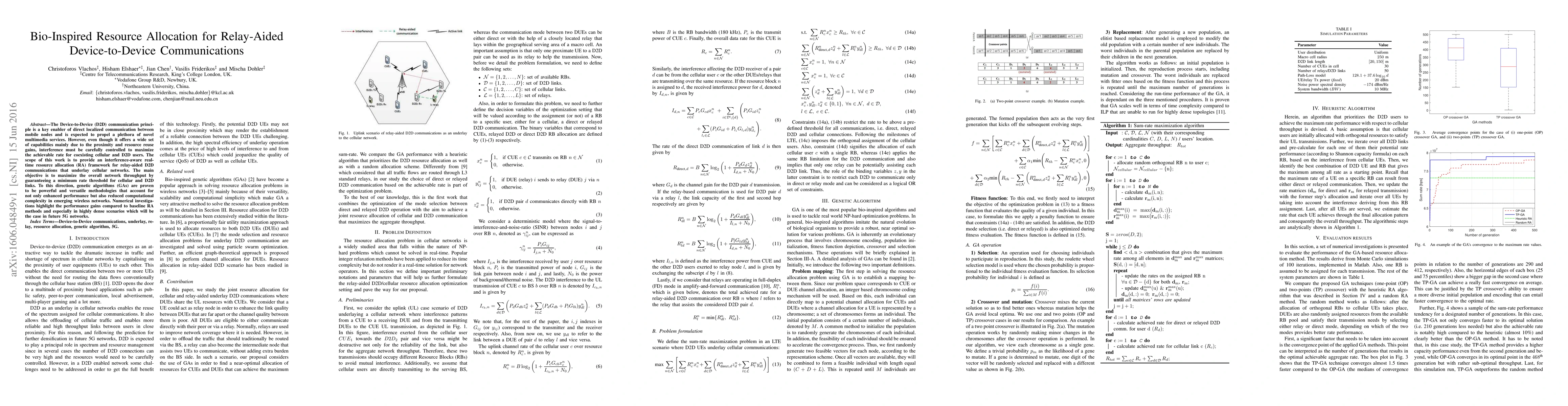 A genetic algorithm-based resource allocation method for relay-aided D2D communication under cellular networks is proposed.
