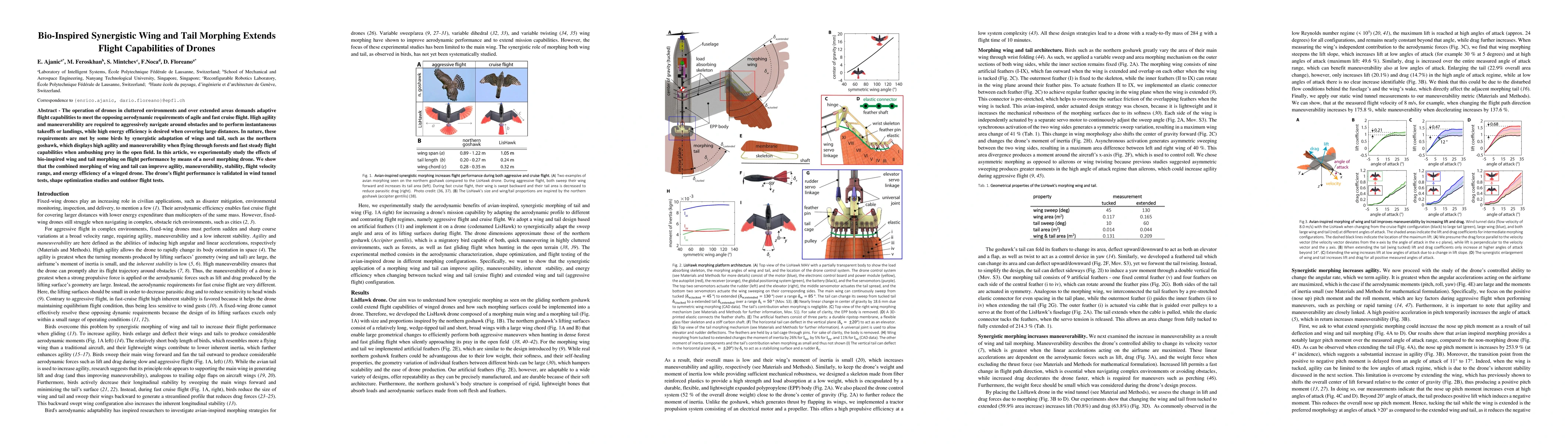 This paper investigates bio-inspired wing and tail morphing in drones to enhance flight performance in complex environments. Experimental results show that synergistic morphing improves agility, maneuverability, stability, velocity range, and energy efficiency, validated through wind tunnel, optimization, and outdoor tests.