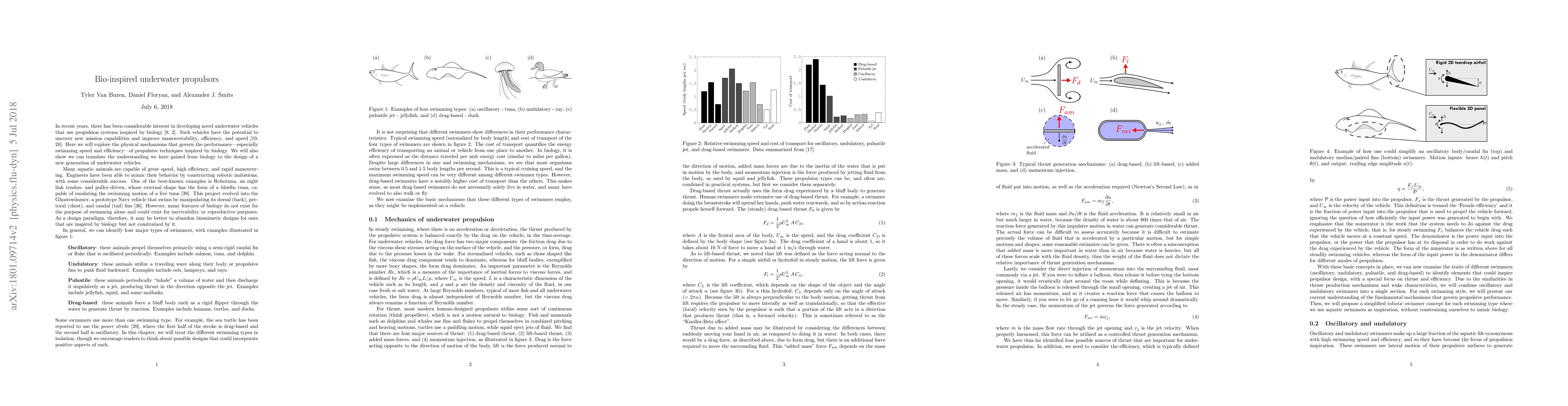 Here we present a general overview of bio-inspired propulsion. We identify the major types of aquatic swimmers (oscillatory, undulatory, pulsatile, and drag-based) and break down their mechanisms for thrust production (drag-based, lift-based, added mass, and momentum injection). For each swimmer, we (1) discuss wake characteristics; (2) derive expressions for thrust and efficiency; and (3) design a specific bio-inspired aquatic vehicle concept. This document will be a book chapter, which at the moment is unpublished.