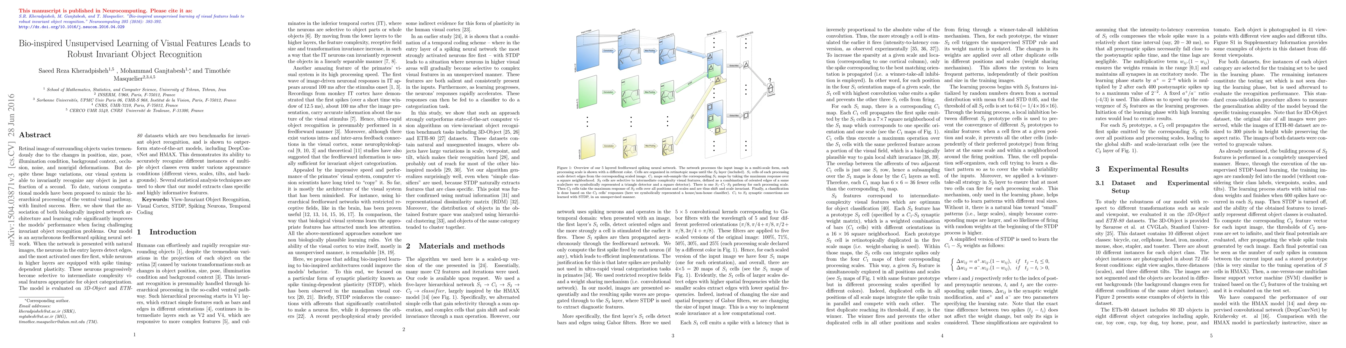 Retinal image of surrounding objects varies tremendously due to the changes in position, size, pose, illumination condition, background context, occlusion, noise, and nonrigid deformations. But despite these huge variations, our visual system is able to invariantly recognize any object in just a fraction of a second. To date, various computational models have been proposed to mimic the hierarchical processing of the ventral visual pathway, with limited success. Here, we show that the association of both biologically inspired network architecture and learning rule significantly improves the models' performance when facing challenging invariant object recognition problems. Our model is an asynchronous feedforward spiking neural network. When the network is presented with natural images, the neurons in the entry layers detect edges, and the most activated ones fire first, while neurons in higher layers are equipped with spike timing-dependent plasticity. These neurons progressively become selective to intermediate complexity visual features appropriate for object categorization. The model is evaluated on 3D-Object and ETH-80 datasets which are two benchmarks for invariant object recognition, and is shown to outperform state-of-the-art models, including DeepConvNet and HMAX. This demonstrates its ability to accurately recognize different instances of multiple object classes even under various appearance conditions (different views, scales, tilts, and backgrounds). Several statistical analysis techniques are used to show that our model extracts class specific and highly informative features.