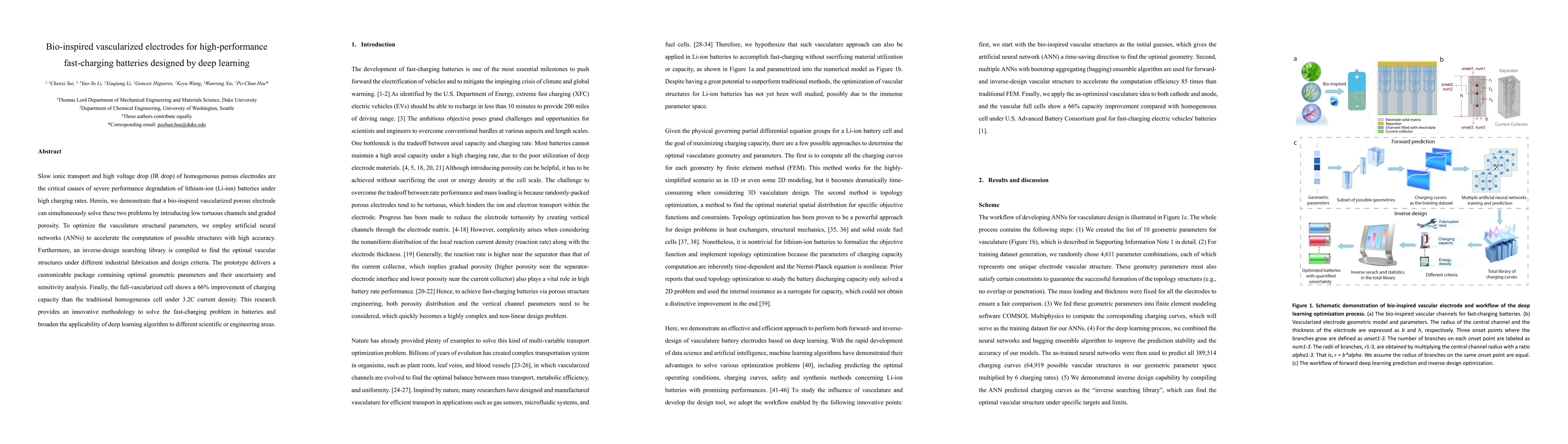 Slow ionic transport and high voltage drop (IR drop) of homogeneous porous electrodes are the critical causes of severe performance degradation of lithium-ion (Li-ion) batteries under high charging rates. Herein, we demonstrate that a bio-inspired vascularized porous electrode can simultaneously solve these two problems by introducing low tortuous channels and graded porosity. To optimize the vasculature structural parameters, we employ artificial neural networks (ANNs) to accelerate the computation of possible structures with high accuracy. Furthermore, an inverse-design searching library is compiled to find the optimal vascular structures under different industrial fabrication and design criteria. The prototype delivers a customizable package containing optimal geometric parameters and their uncertainty and sensitivity analysis. Finally, the full-vascularized cell shows a 66% improvement of charging capacity than the traditional homogeneous cell under 3.2C current density. This research provides an innovative methodology to solve the fast-charging problem in batteries and broaden the applicability of deep learning algorithm to different scientific or engineering areas.