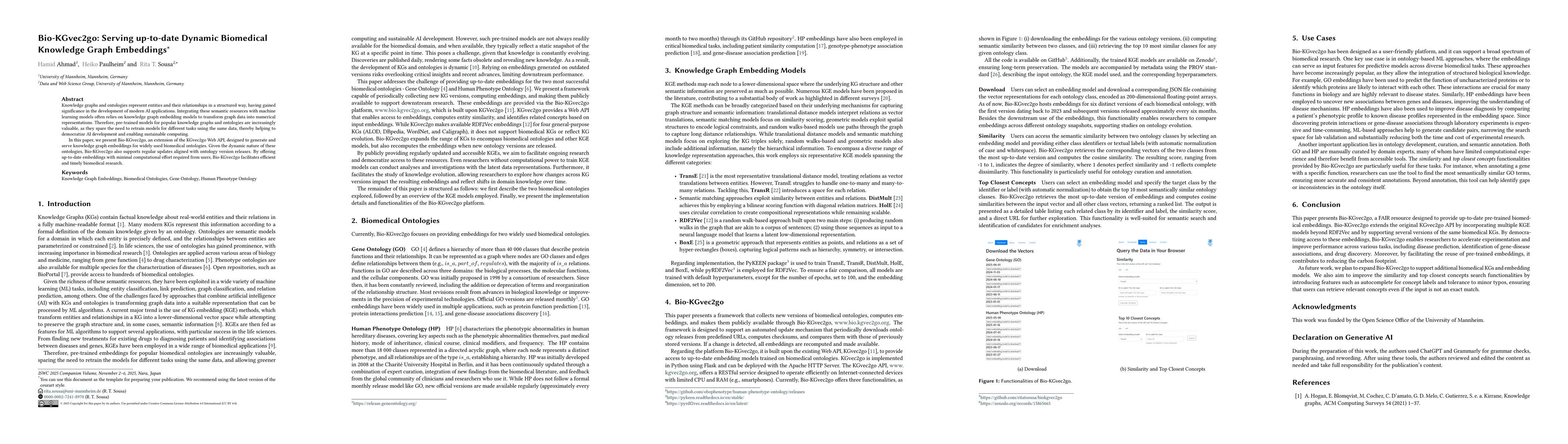 Knowledge graphs and ontologies represent entities and their relationships in a structured way, having gained significance in the development of modern AI applications. Integrating these semantic resources with machine learning models often relies on knowledge graph embedding models to transform graph data into numerical representations. Therefore, pre-trained models for popular knowledge graphs and ontologies are increasingly valuable, as they spare the need to retrain models for different tasks using the same data, thereby helping to democratize AI development and enabling sustainable computing. In this paper, we present Bio-KGvec2go, an extension of the KGvec2go Web API, designed to generate and serve knowledge graph embeddings for widely used biomedical ontologies. Given the dynamic nature of these ontologies, Bio-KGvec2go also supports regular updates aligned with ontology version releases. By offering up-to-date embeddings with minimal computational effort required from users, Bio-KGvec2go facilitates efficient and timely biomedical research.