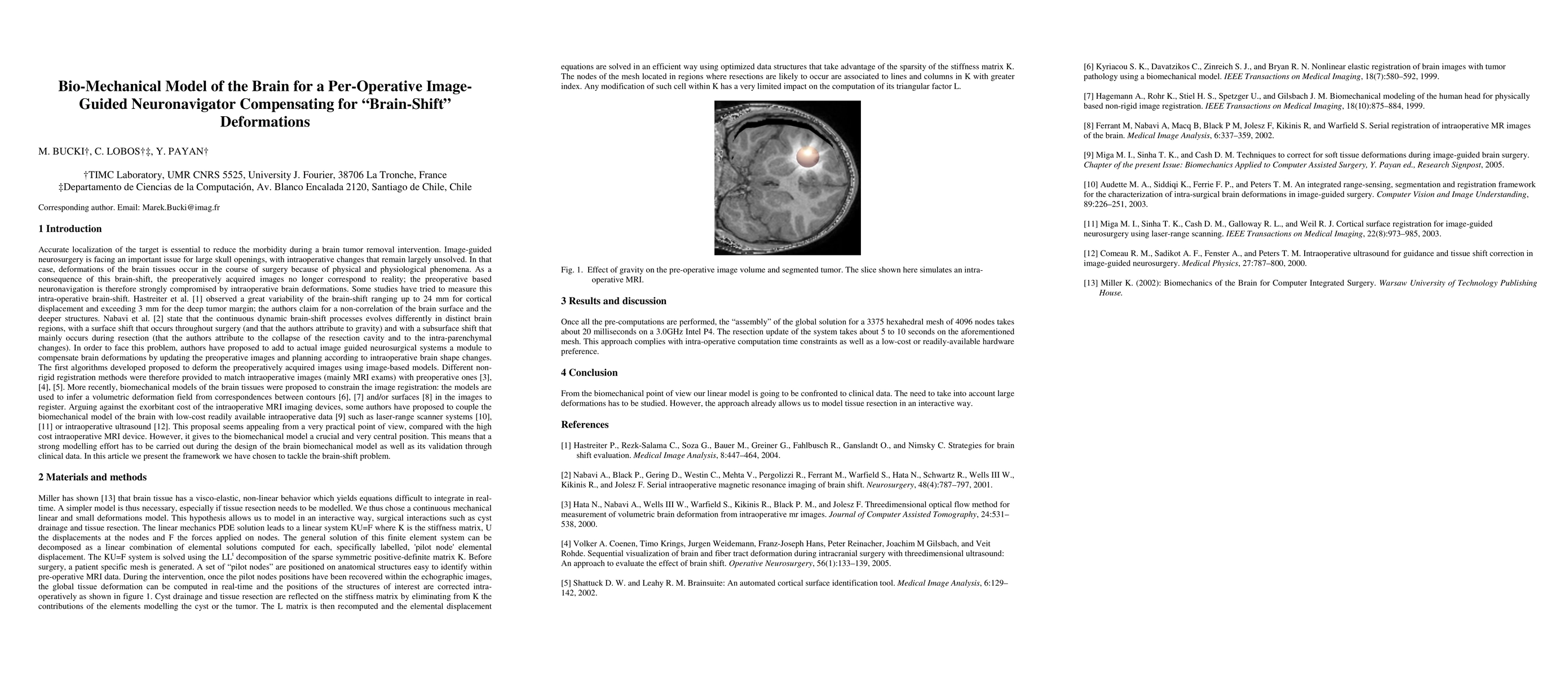 This paper proposes a bio-mechanical model for a neuronavigator that compensates for "brain-shift" during neurosurgery, generating patient-specific finite element meshes to account for tissue deformations and surgical modifications, thereby improving the accuracy of intra-operative image guidance.