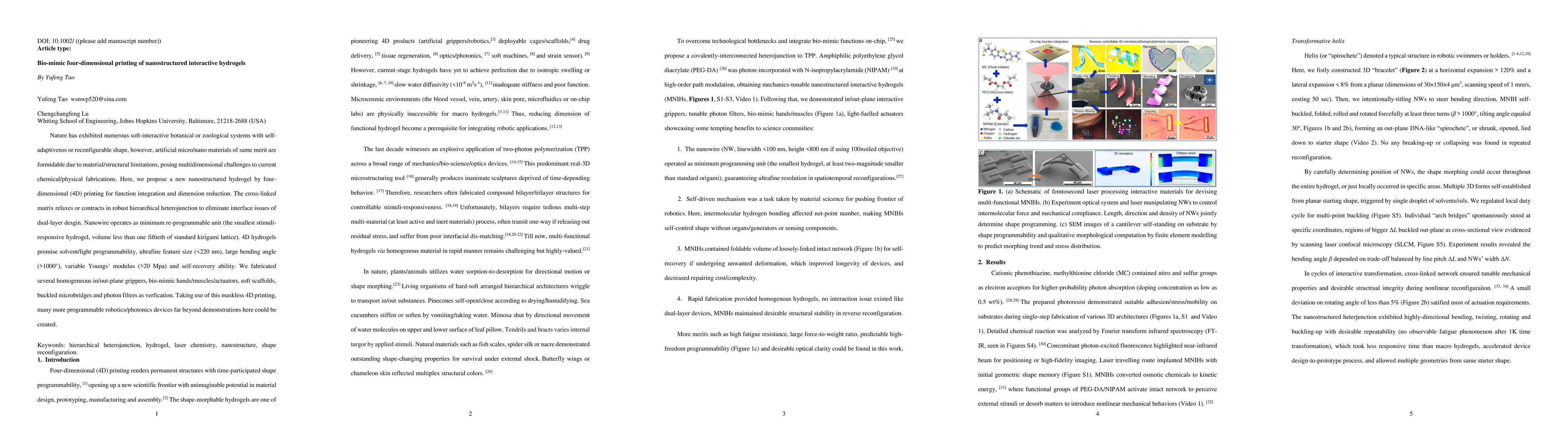 Nature has exhibited numerous soft-interactive botanical or zoological systems with self-adaptivenss or reconfigurable shape, however, artificial micro/nano materials of same merit are formidable due to material/structural limitations, posing multidimensional challenges to current chemical/physical fabrications. Here, we propose a new nanostructured hydrogel by four-dimensional (4D) printing for function integration and dimension reduction. The cross-linked matrix relaxes or contracts in robust hierarchical heterojunction to eliminate interface issues of dual-layer desgin.