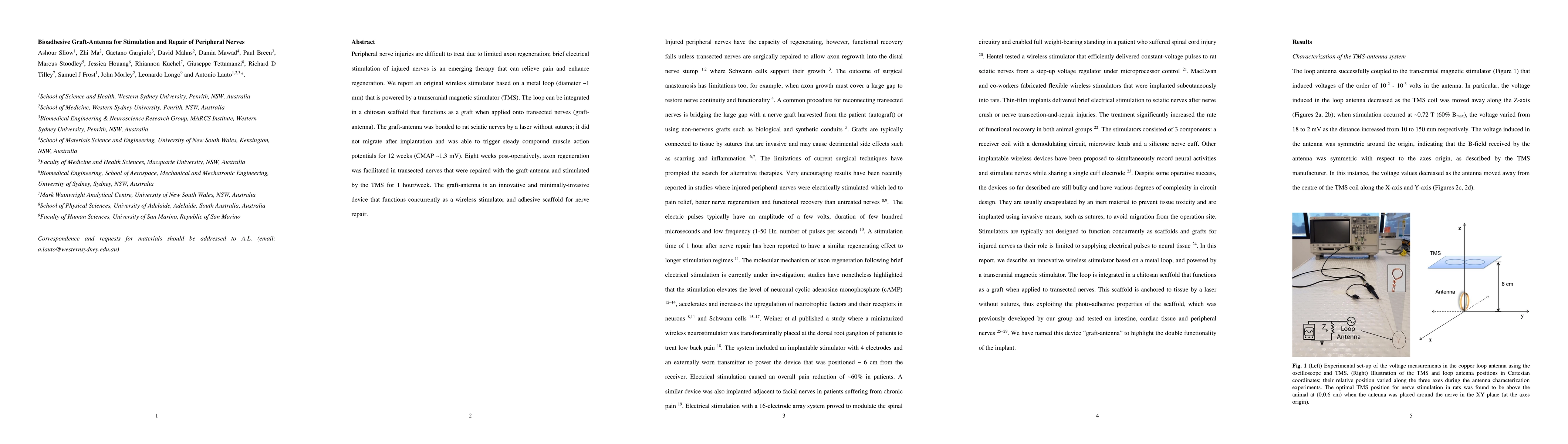 This paper introduces a novel bioadhesive graft-antenna combining a metal loop stimulator with a chitosan scaffold to repair and stimulate peripheral nerves. The device, powered by transcranial magnetic stimulation, effectively promotes axon regeneration and muscle action potentials in rat sciatic nerves over a 12-week period.