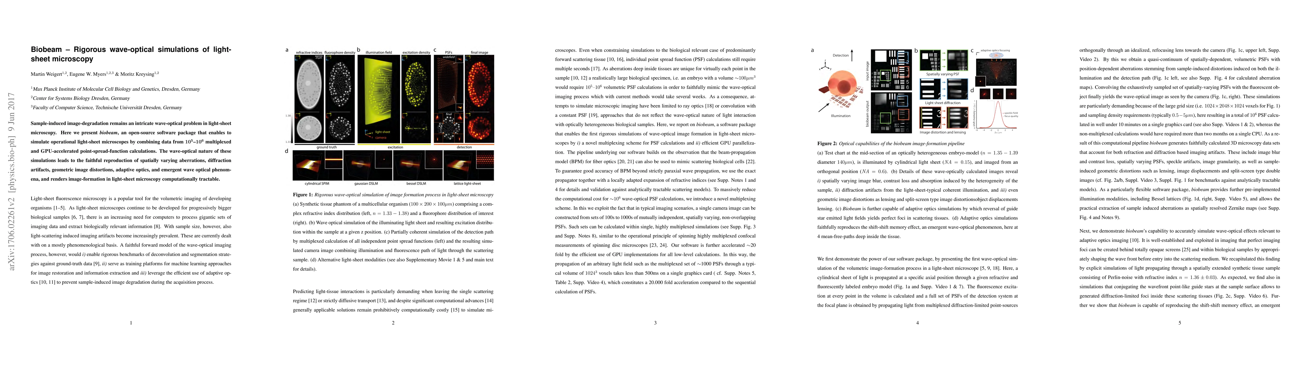 Biobeam is an open-source software for rigorous wave-optical simulations of light-sheet microscopy, enabling accurate reproduction of complex image-degradation phenomena through GPU-accelerated point-spread-function calculations. It facilitates the computationally feasible modeling of spatially varying aberrations and diffraction artifacts.