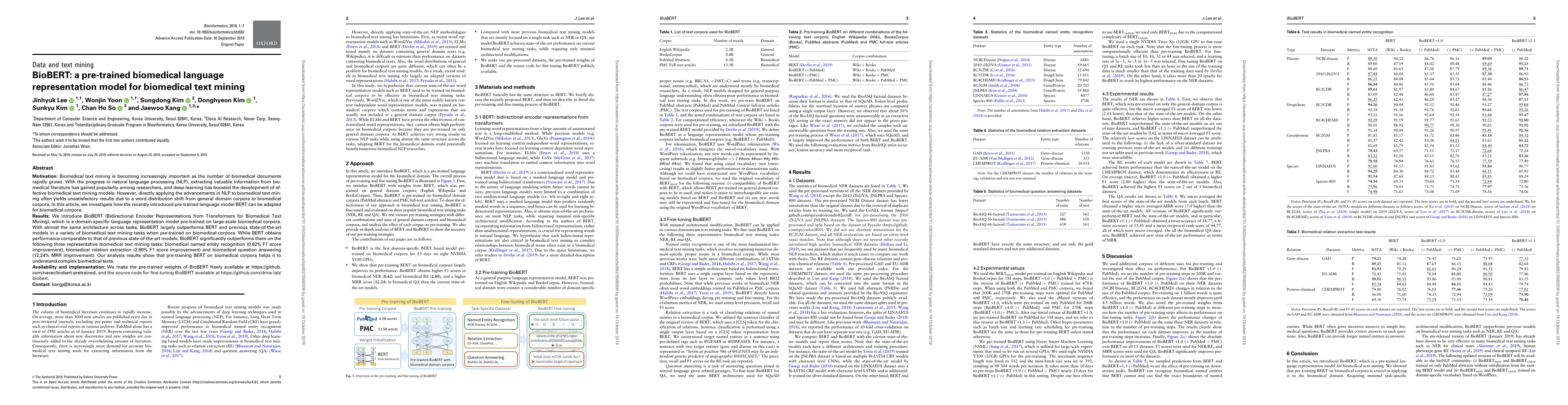 Biomedical text mining is becoming increasingly important as the number of biomedical documents rapidly grows. With the progress in natural language processing (NLP), extracting valuable information from biomedical literature has gained popularity among researchers, and deep learning has boosted the development of effective biomedical text mining models. However, directly applying the advancements in NLP to biomedical text mining often yields unsatisfactory results due to a word distribution shift from general domain corpora to biomedical corpora. In this article, we investigate how the recently introduced pre-trained language model BERT can be adapted for biomedical corpora. We introduce BioBERT (Bidirectional Encoder Representations from Transformers for Biomedical Text Mining), which is a domain-specific language representation model pre-trained on large-scale biomedical corpora. With almost the same architecture across tasks, BioBERT largely outperforms BERT and previous state-of-the-art models in a variety of biomedical text mining tasks when pre-trained on biomedical corpora. While BERT obtains performance comparable to that of previous state-of-the-art models, BioBERT significantly outperforms them on the following three representative biomedical text mining tasks: biomedical named entity recognition (0.62% F1 score improvement), biomedical relation extraction (2.80% F1 score improvement) and biomedical question answering (12.24% MRR improvement). Our analysis results show that pre-training BERT on biomedical corpora helps it to understand complex biomedical texts. We make the pre-trained weights of BioBERT freely available at https://github.com/naver/biobert-pretrained, and the source code for fine-tuning BioBERT available at https://github.com/dmis-lab/biobert.