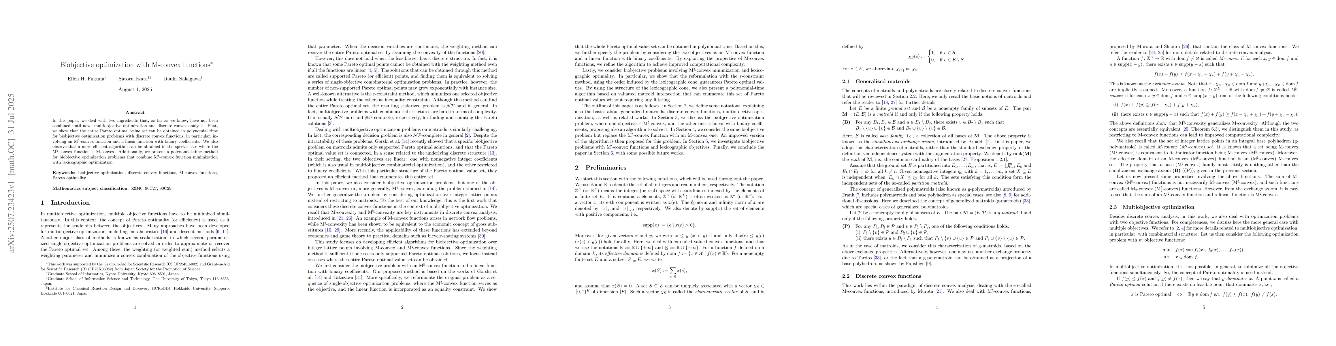 In this paper, we deal with two ingredients that, as far as we know, have not been combined until now: multiobjective optimization and discrete convex analysis. First, we show that the entire Pareto optimal value set can be obtained in polynomial time for biobjective optimization problems with discrete convex functions, in particular, involving an M$^\natural$-convex function and a linear function with binary coefficients. We also observe that a more efficient algorithm can be obtained in the special case where the M$^\natural$-convex function is M-convex. Additionally, we present a polynomial-time method for biobjective optimization problems that combine M$^\natural$-convex function minimization with lexicographic optimization.