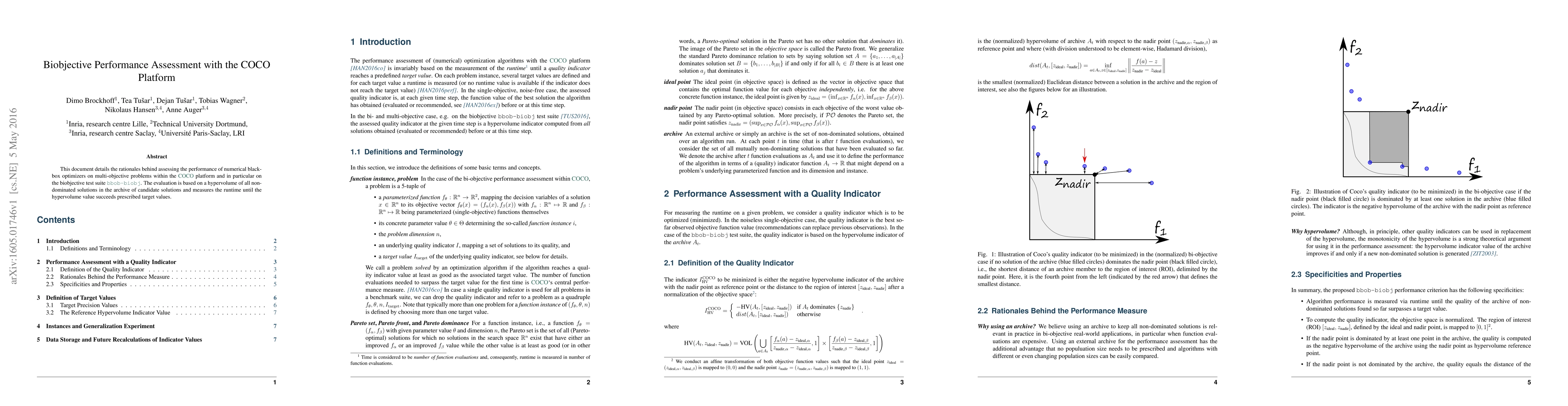 This document details the rationales behind assessing the performance of numerical black-box optimizers on multi-objective problems within the COCO platform and in particular on the biobjective test suite bbob-biobj. The evaluation is based on a hypervolume of all non-dominated solutions in the archive of candidate solutions and measures the runtime until the hypervolume value succeeds prescribed target values.