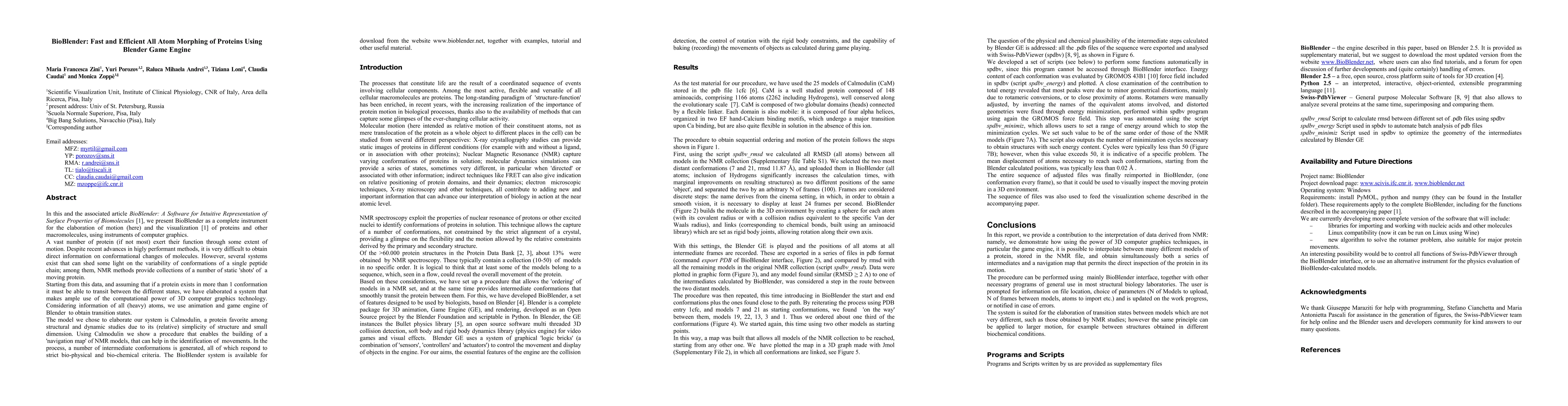 In this and the associated article 'BioBlender: A Software for Intuitive Representation of Surface Properties of Biomolecules', (Andrei et al) we present BioBlender as a complete instrument for the elaboration of motion (here) and the visualization (Andrei et al) of proteins and other macromolecules, using instruments of computer graphics. A vast number of protein (if not most) exert their function through some extent of motion. Despite recent advances in higly performant methods, it is very difficult to obtain direct information on conformational changes of molecules. However, several systems exist that can shed some light on the variability of conformations of a single peptide chain; among them, NMR methods provide collections of a number of static 'shots' of a moving protein. Starting from this data, and assuming that if a protein exists in more than 1 conformation it must be able to transit between the different states, we have elaborated a system that makes ample use of the computational power of 3D computer graphics technology. Considering information of all (heavy) atoms, we use animation and game engine of Blender to obtain transition states. The model we chose to elaborate our system is Calmodulin, a protein favorite among structural and dynamic studies due to its (relative) simplicity of structure and small dimension. Using Calmodulin we show a procedure that enables the building of a 'navigation map' of NMR models, that can help in the identification of movements. In the process, a number of intermediate conformations is generated, all of which respond to strict bio-physical and bio-chemical criteria. The BioBlender system is available for download from the website www.bioblender.net, together with examples, tutorial and other useful material.