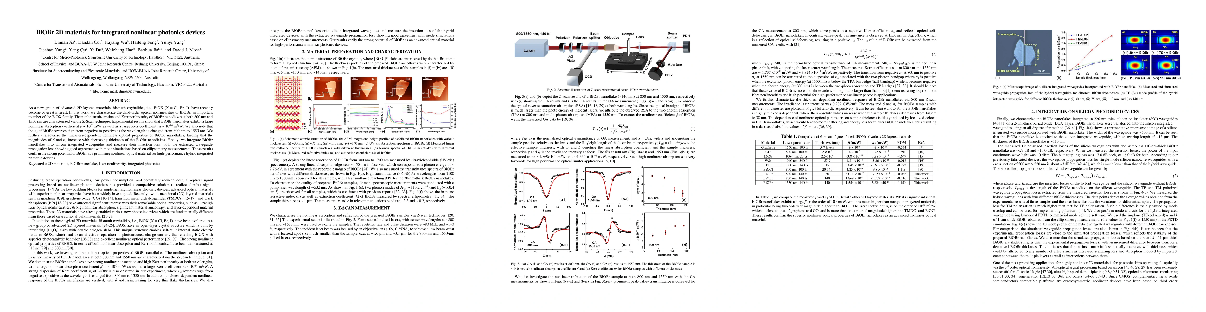 This research investigates the third-order optical nonlinearities of BiOBr nanoflakes, revealing significant nonlinear absorption and Kerr effects, with a large nonlinear absorption coefficient and a wavelength-dependent Kerr coefficient. Integration into silicon waveguides shows promising performance for advanced photonic applications.