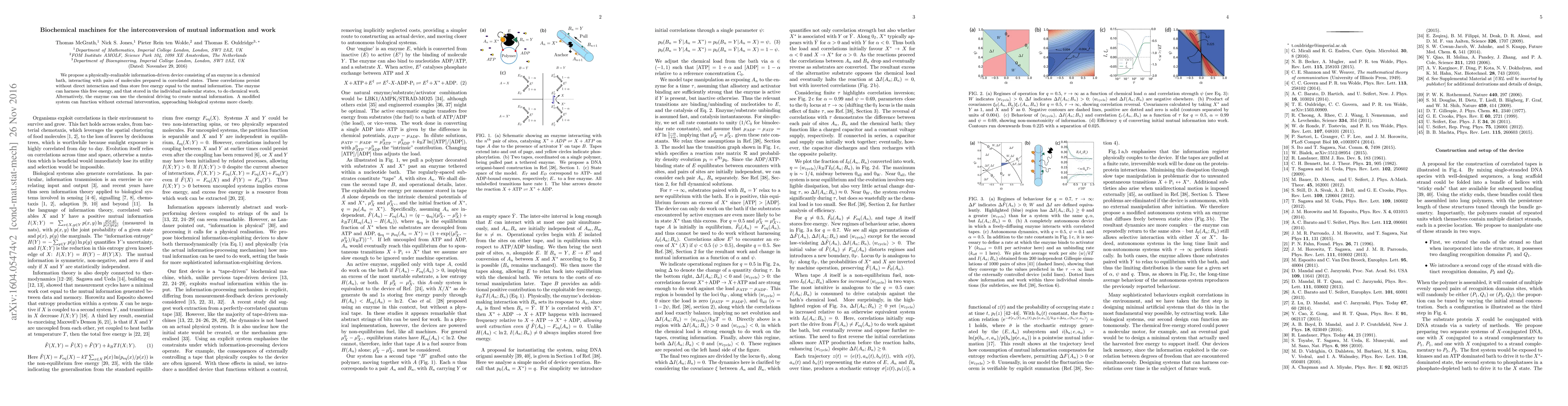 We propose a physically-realisable biochemical device that is coupled to a biochemical reservoir of mutual information, fuel molecules and a chemical bath. Mutual information allows work to be done on the bath even when the fuel molecules appear to be in equilibrium; alternatively, mutual information can be created by driving from the fuel or the bath. The system exhibits diverse behaviour, including a regime in which the information, despite increasing during the reaction, enhances the extracted work. We further demonstrate that a modified device can function without the need for external manipulation, eliminating the need for a complex and potentially costly control.