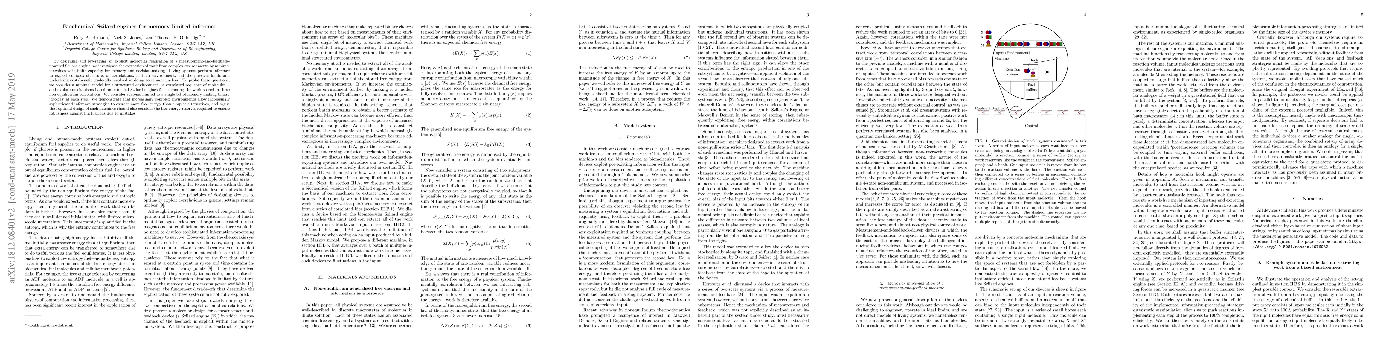 This paper explores biochemical Szilard engines, which extract work from complex environments using minimal memory and decision-making capacity. It demonstrates that more sophisticated inference strategies can extract more energy from complex environments, emphasizing the need for energy reserves to maintain robustness against errors.